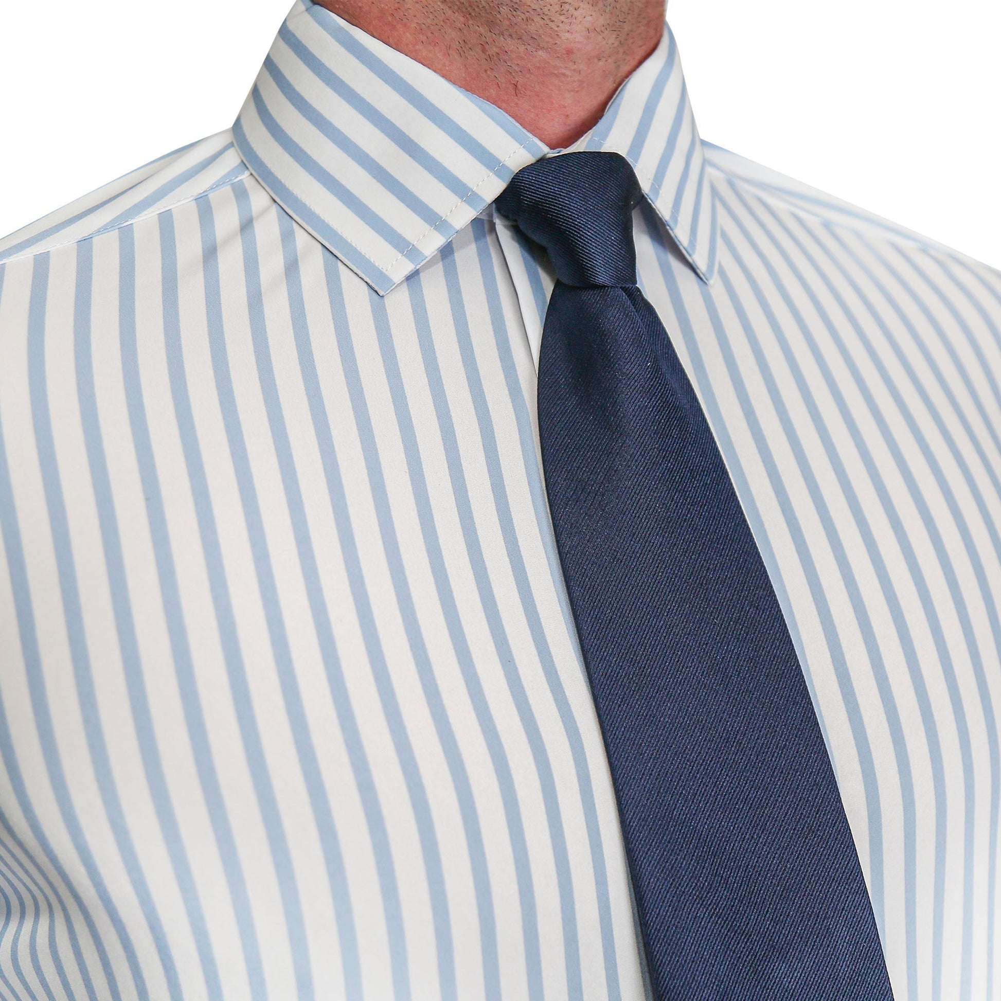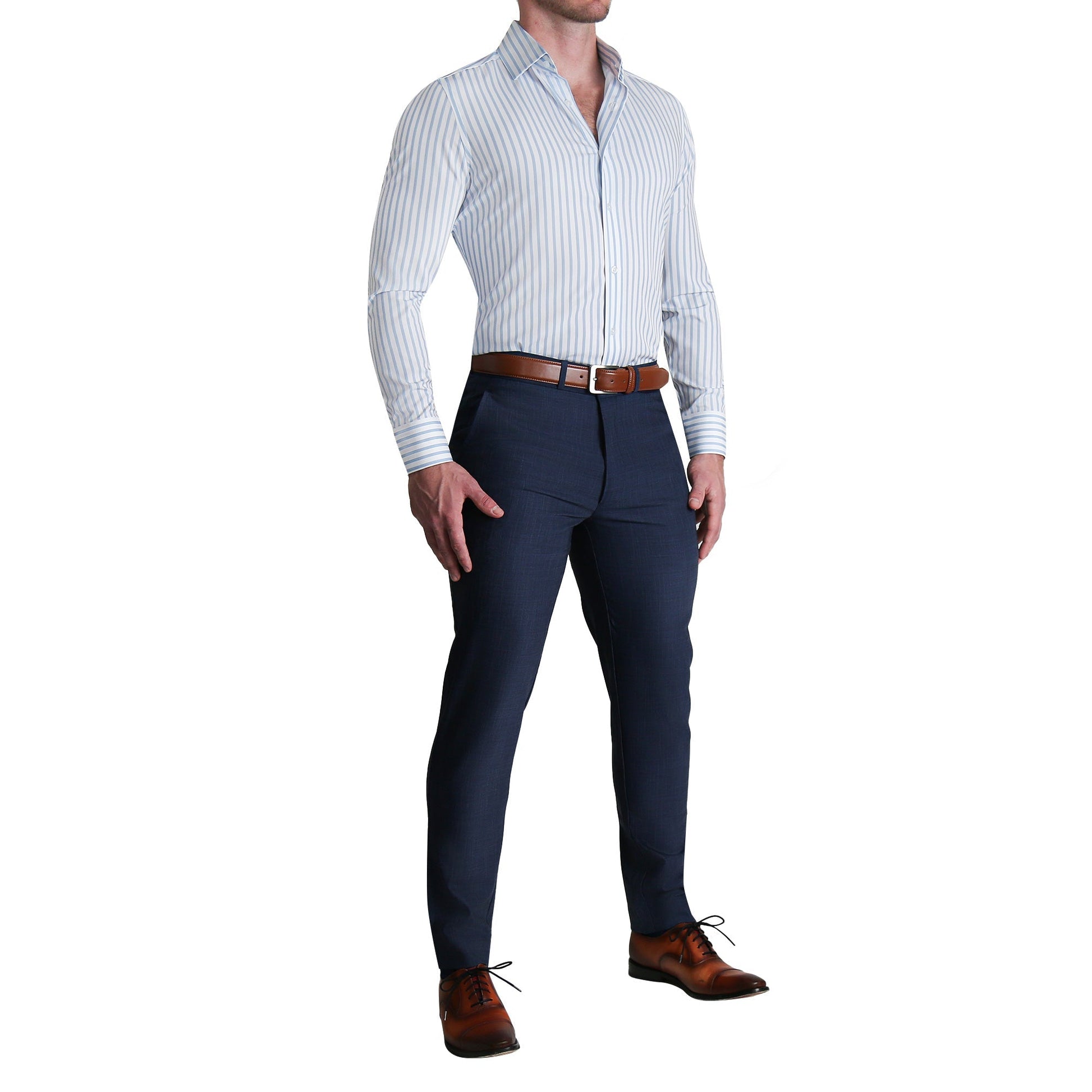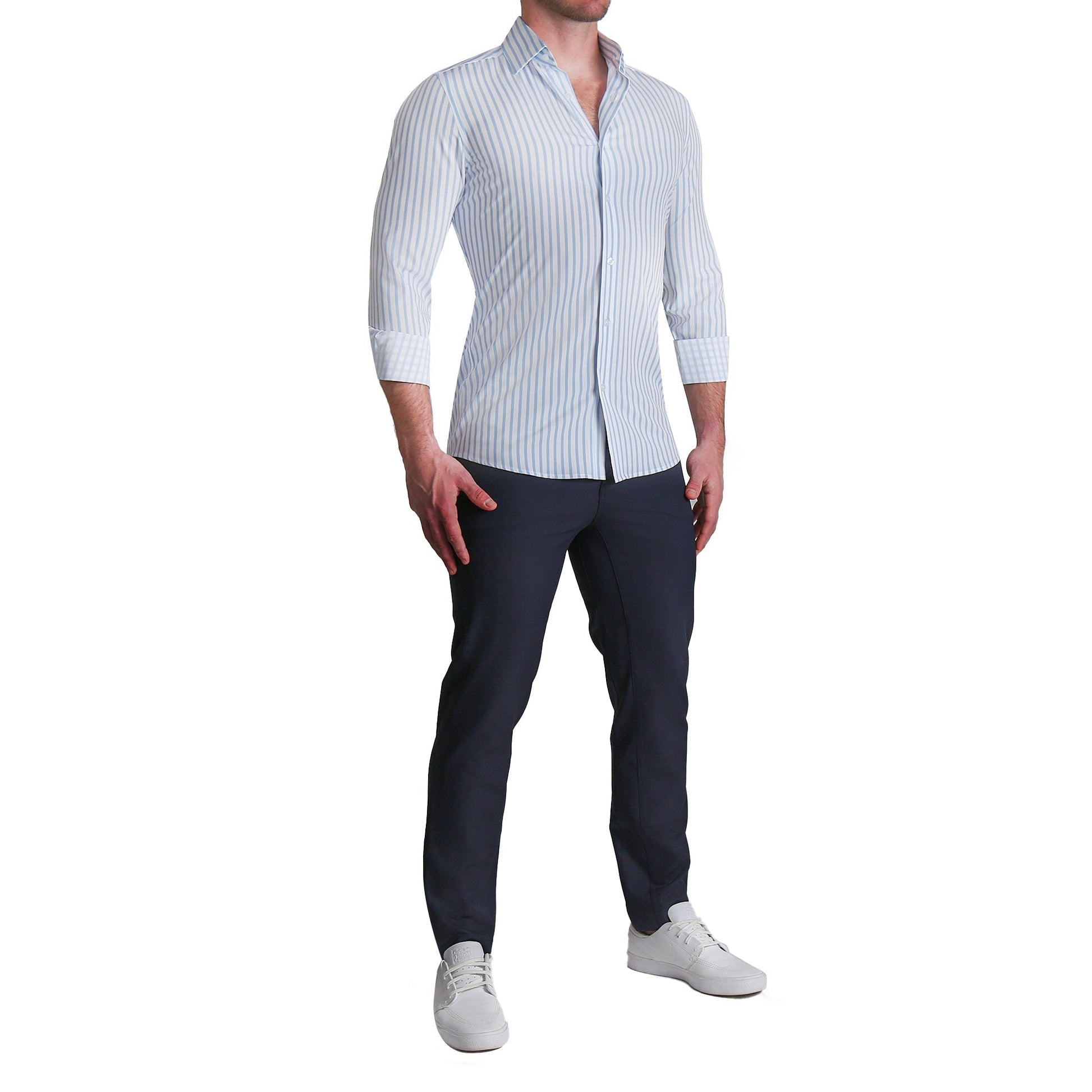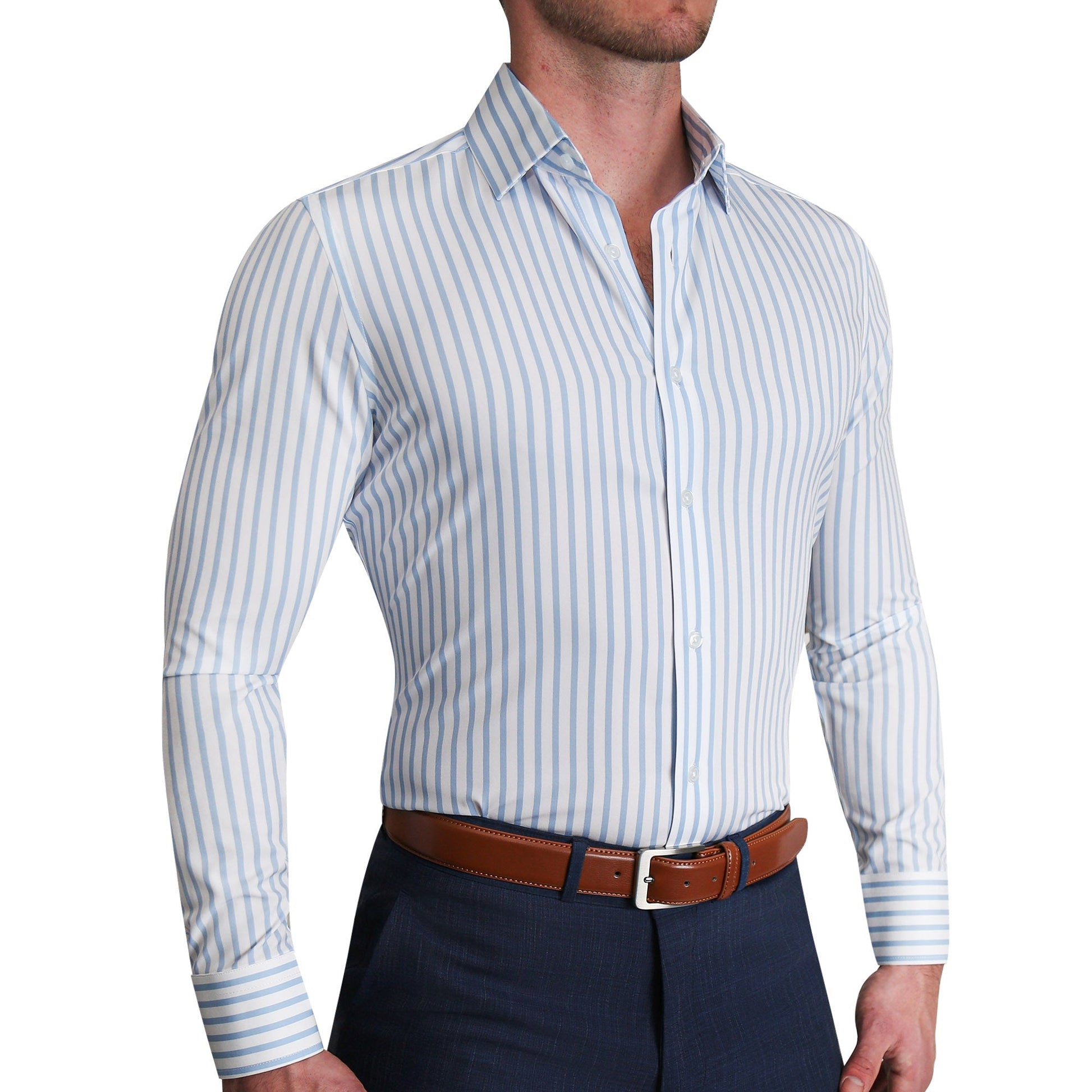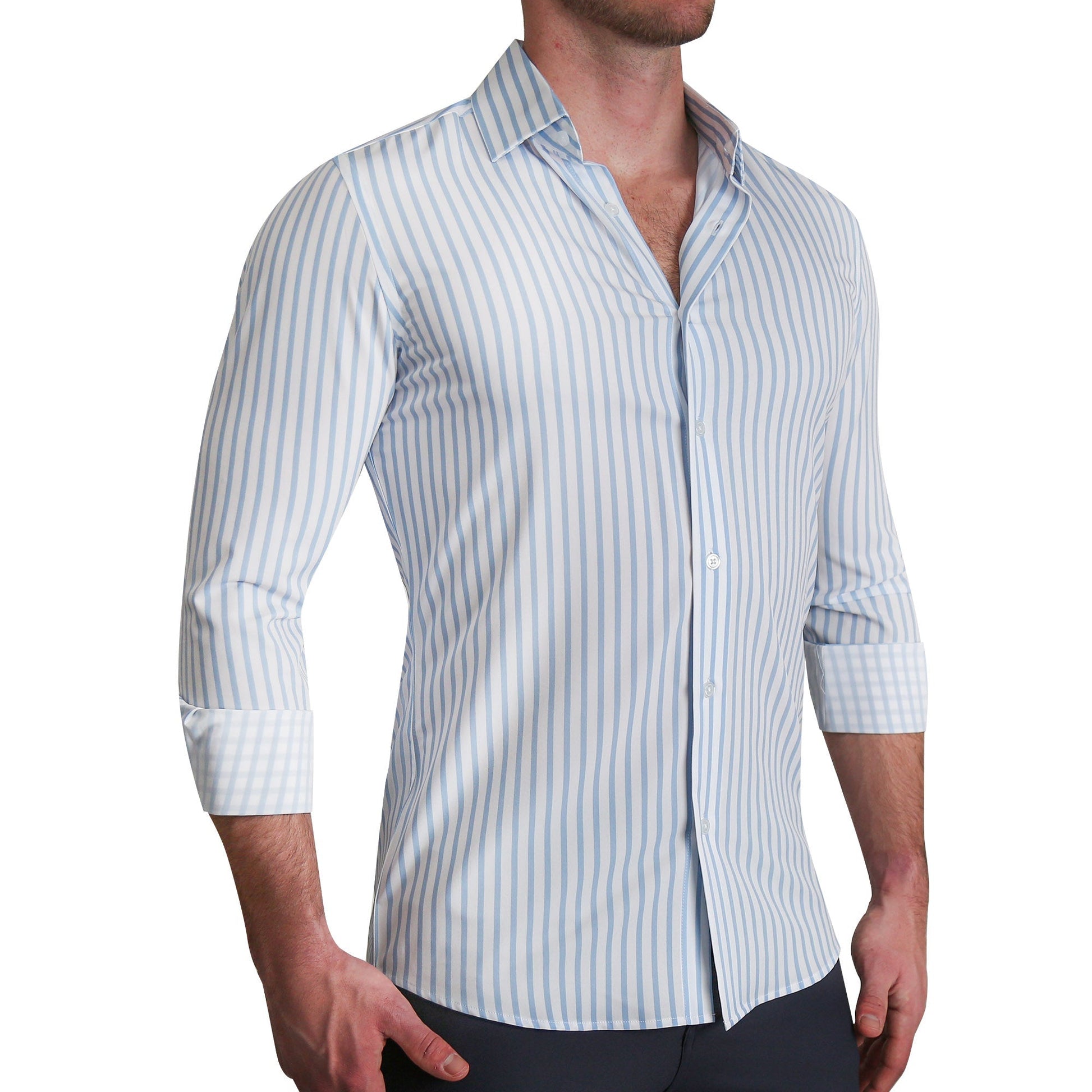 Our signature athletic fit dress shirt crafted from performance stretch fabrics. "The Francisco" Light Blue Mid-Stripe is an excellent business casual staple that makes a versatile addition to any dress shirt collection.