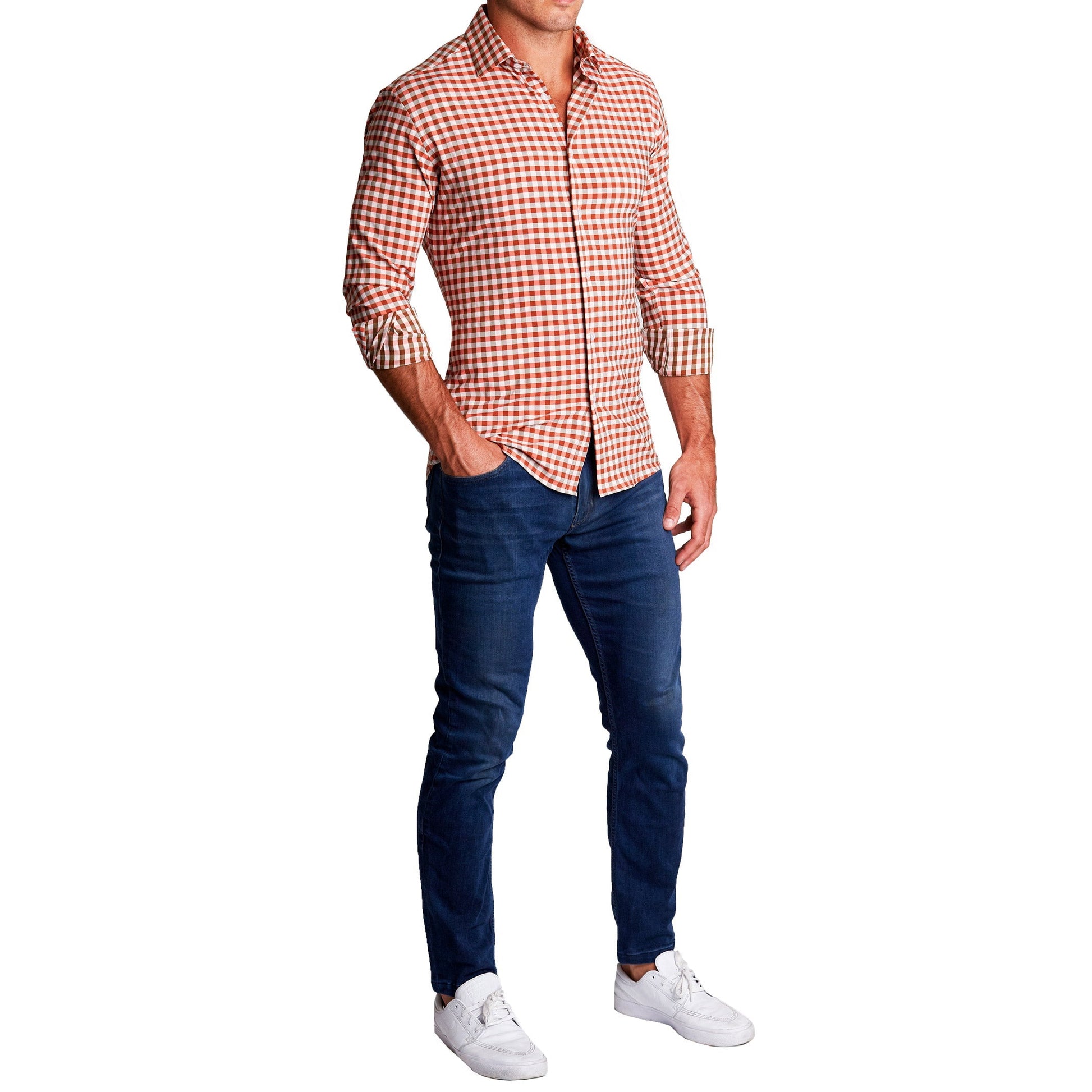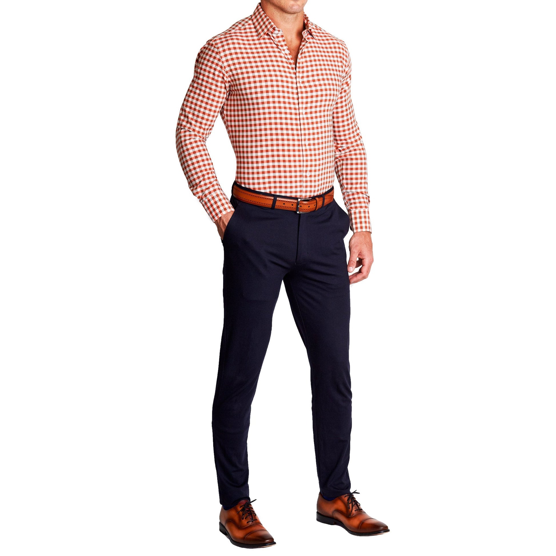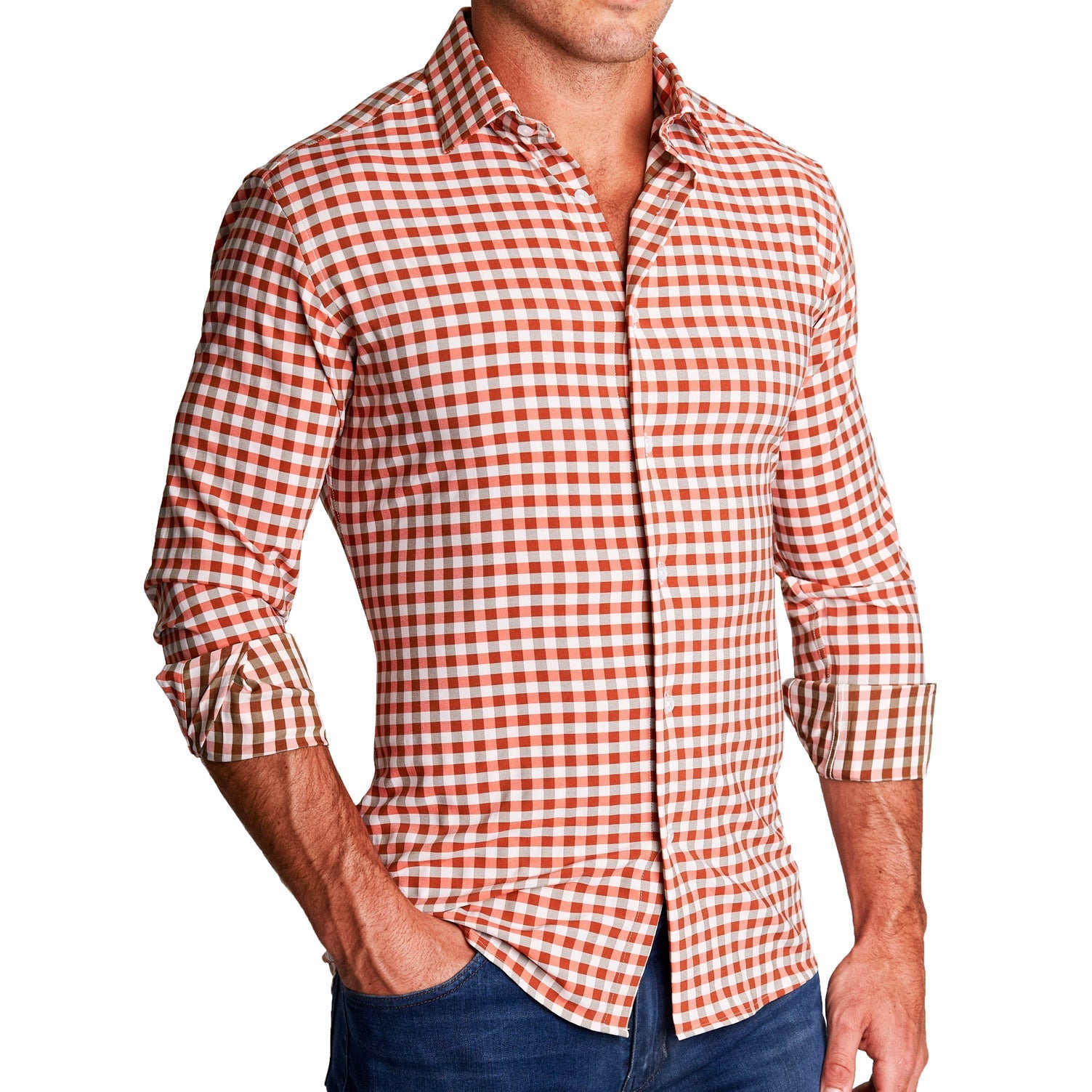 Our signature athletic fit dress shirt crafted from performance stretch fabrics. "The Harrison" Orange Big Check is an excellent business casual staple that makes a versatile addition to any dress shirt collection.