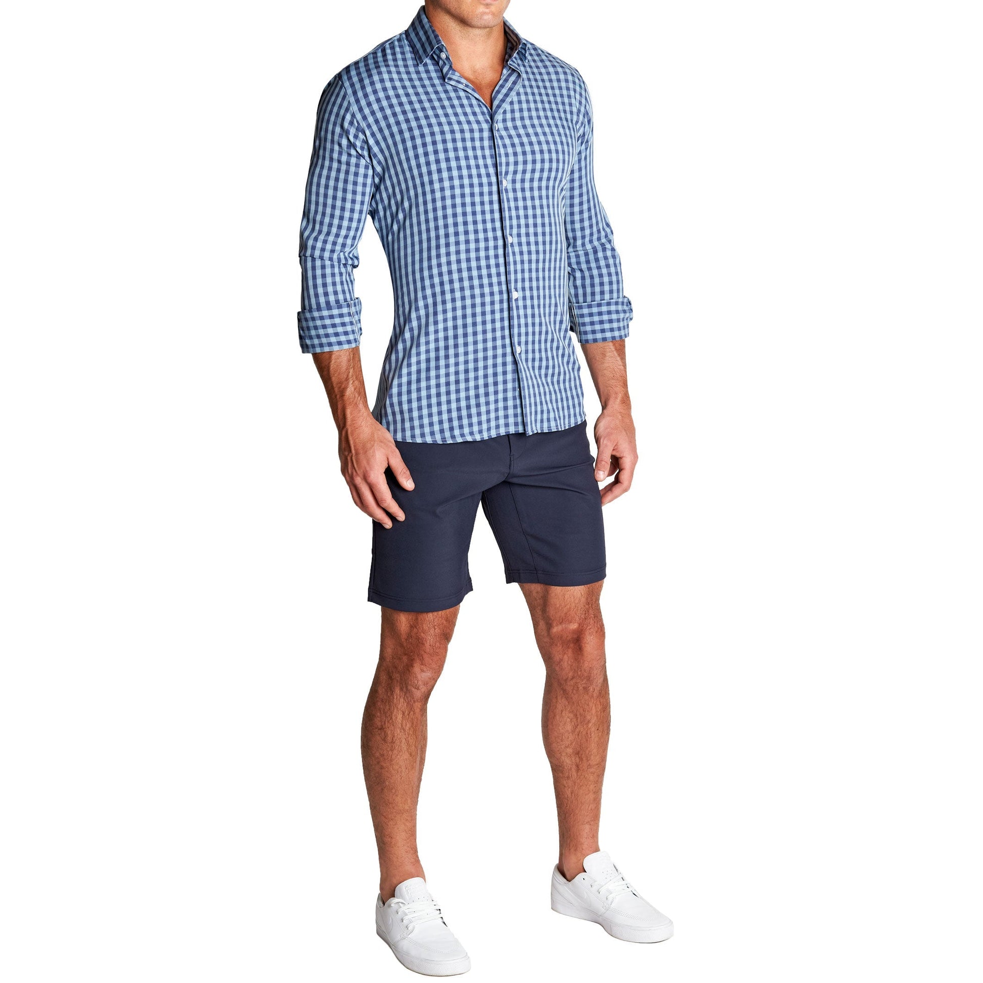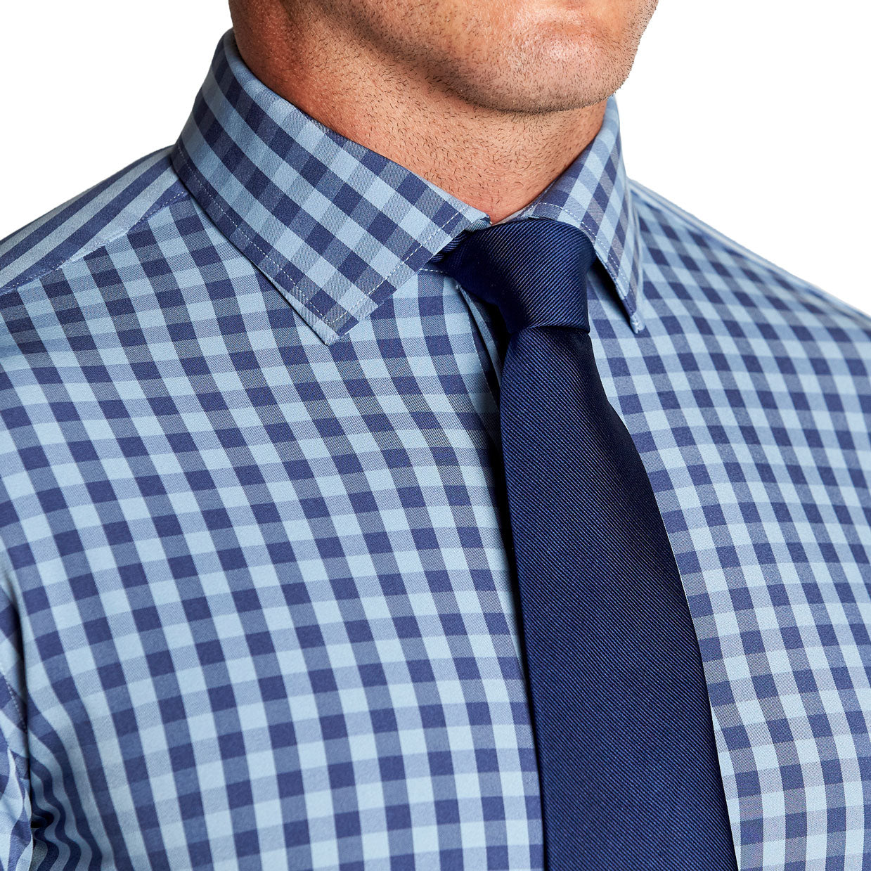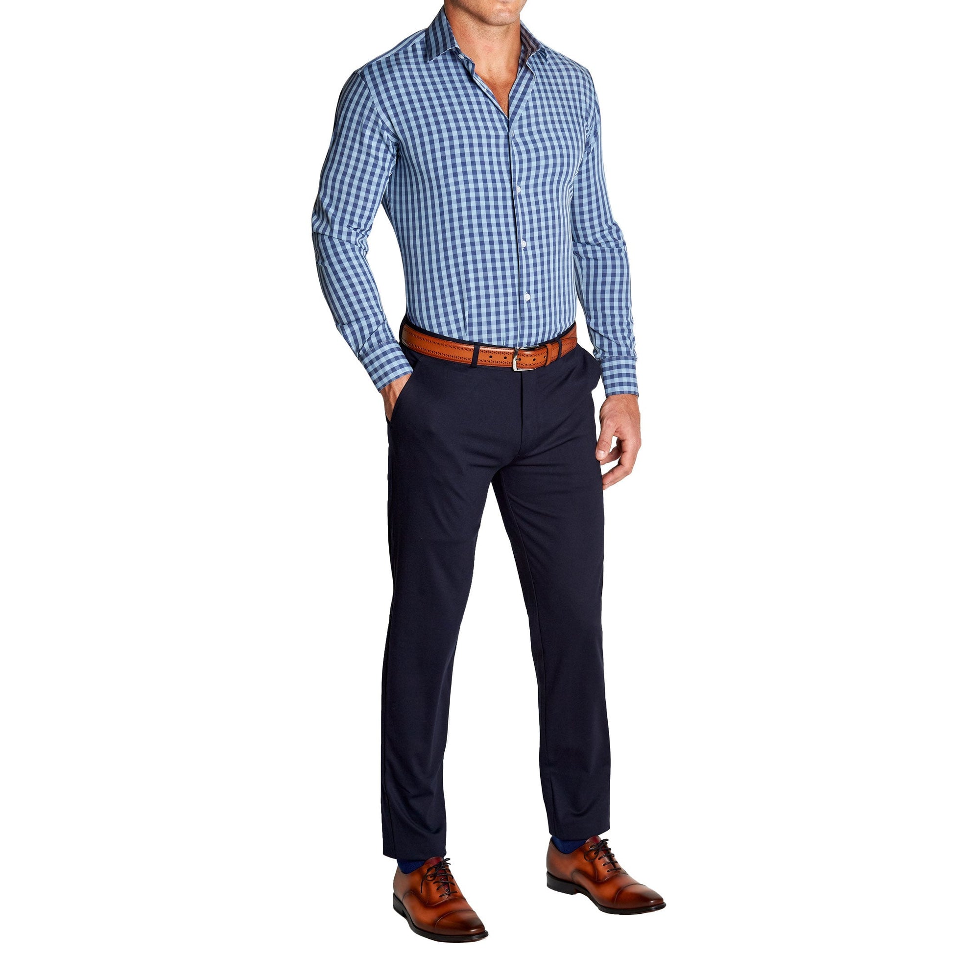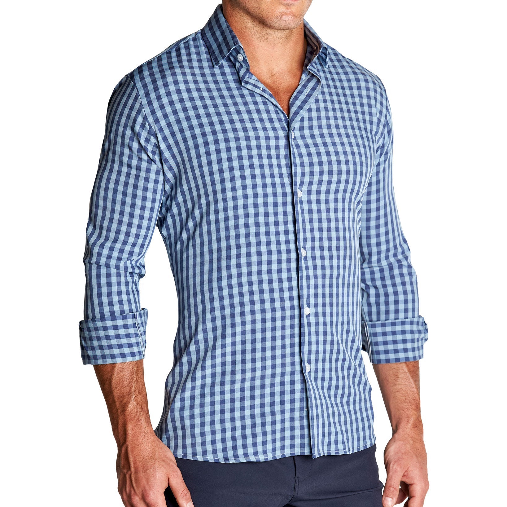 Our signature athletic fit dress shirt crafted from performance stretch fabrics. "The Henry" Steel Blue and Light Blue Big Gingham is an excellent business casual staple that makes a versatile addition to any dress shirt collection.