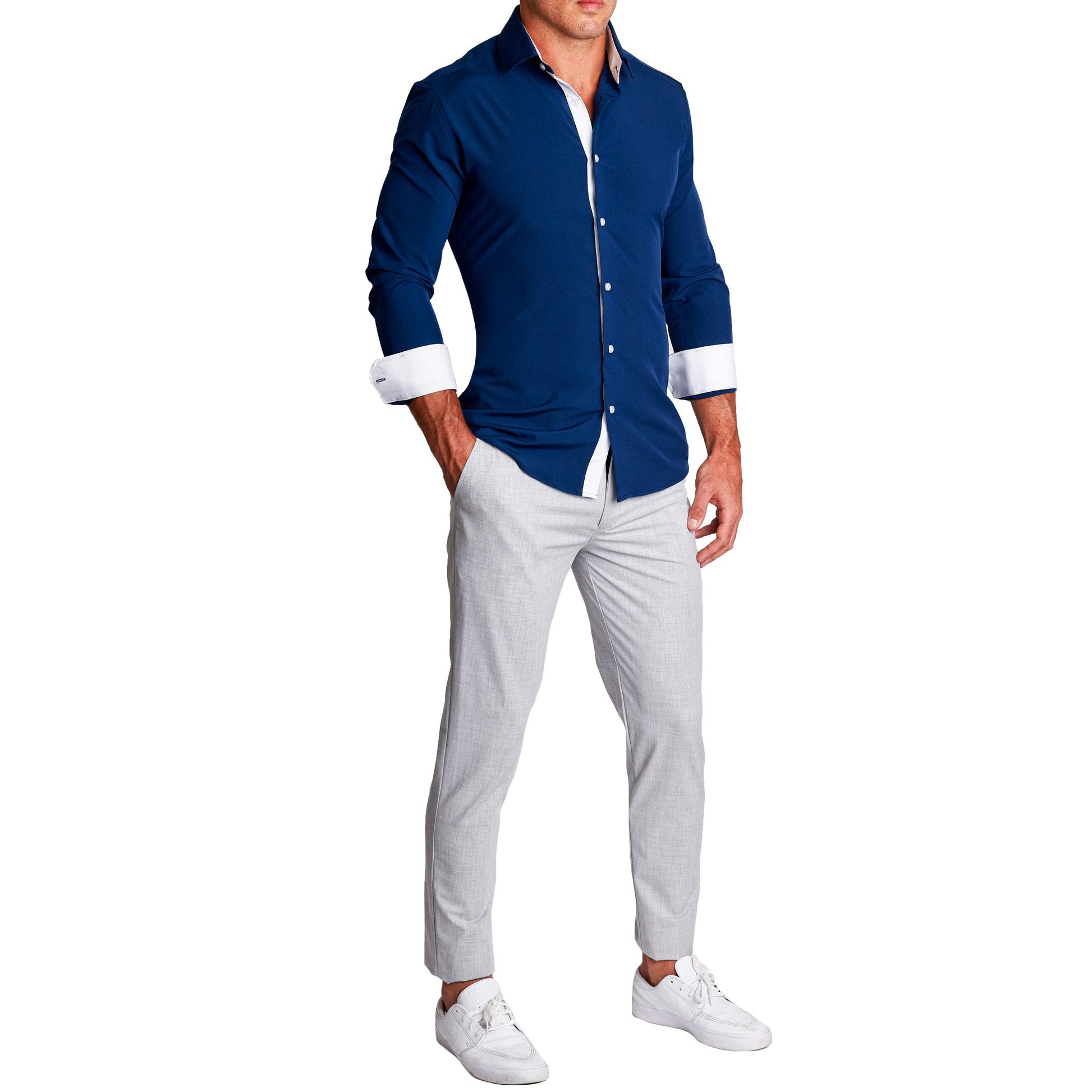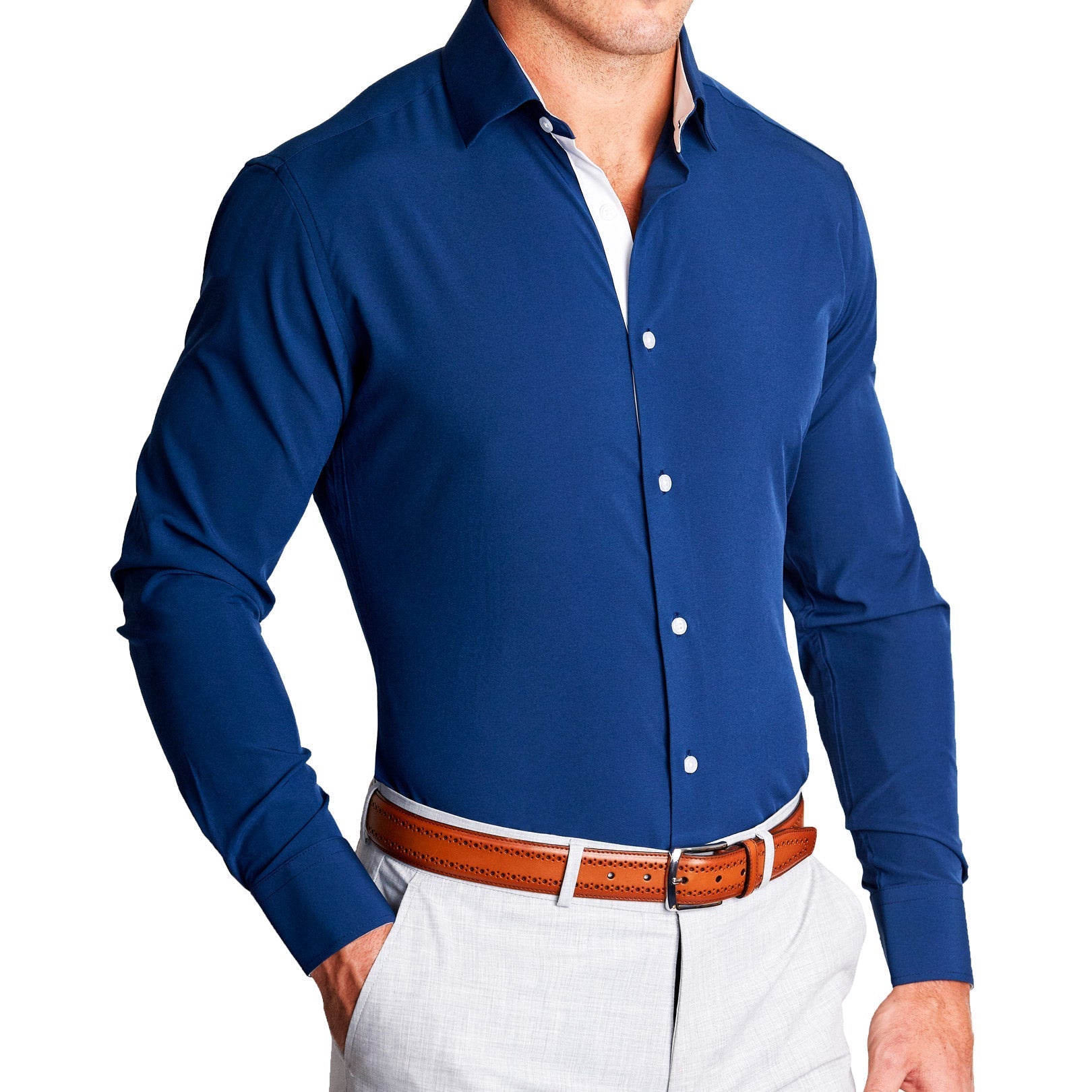 Our signature athletic fit dress shirt crafted from performance stretch fabrics. "The Howard" Limited Edition: Navy and White Accents is an excellent business casual staple that makes a versatile addition to any dress shirt collection.