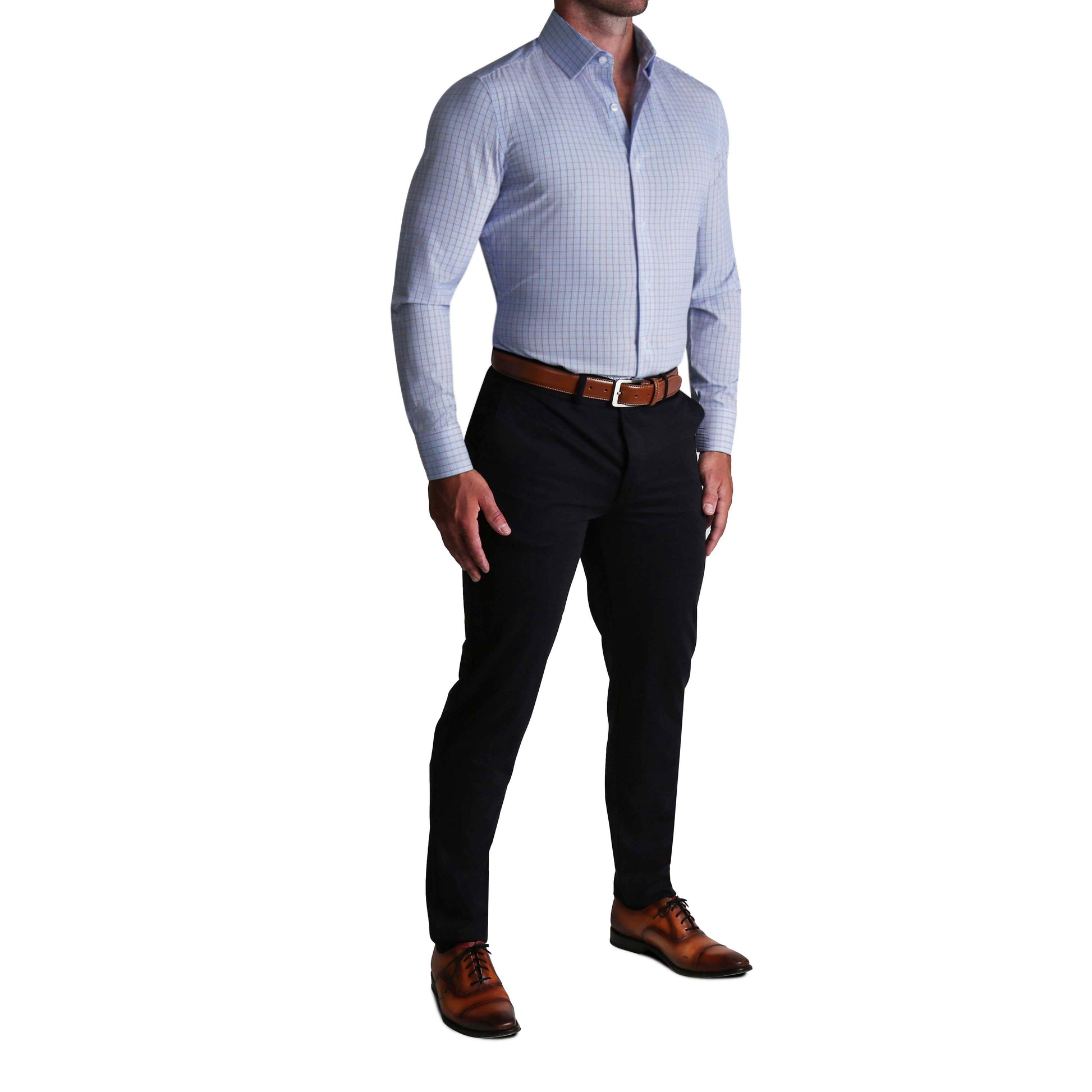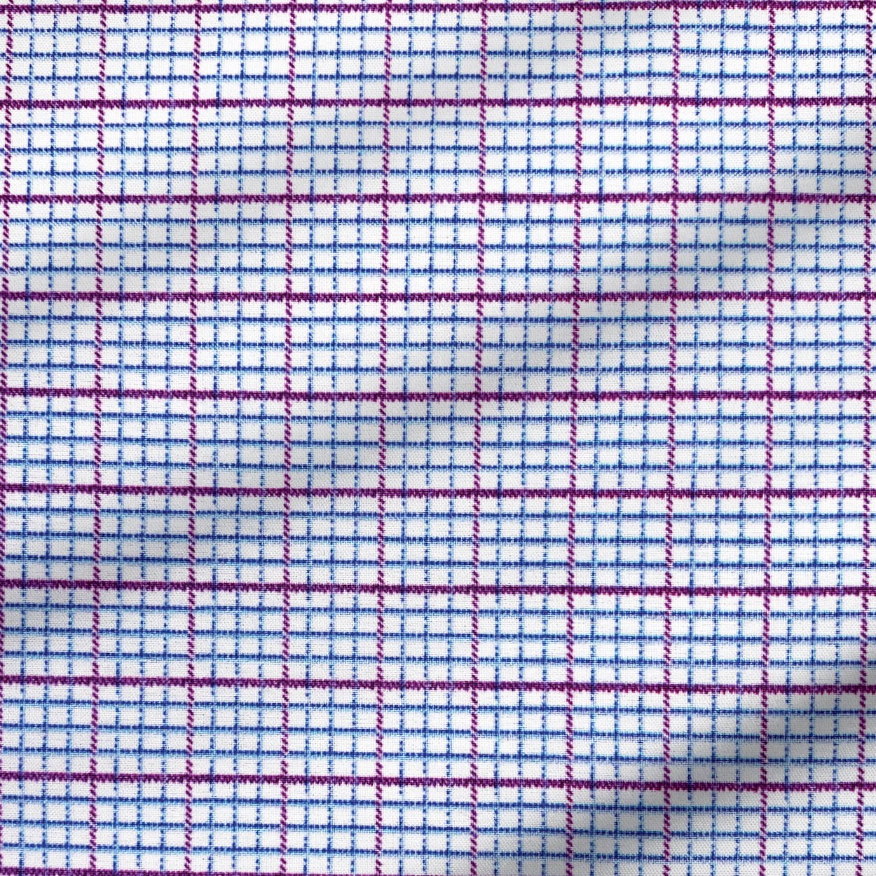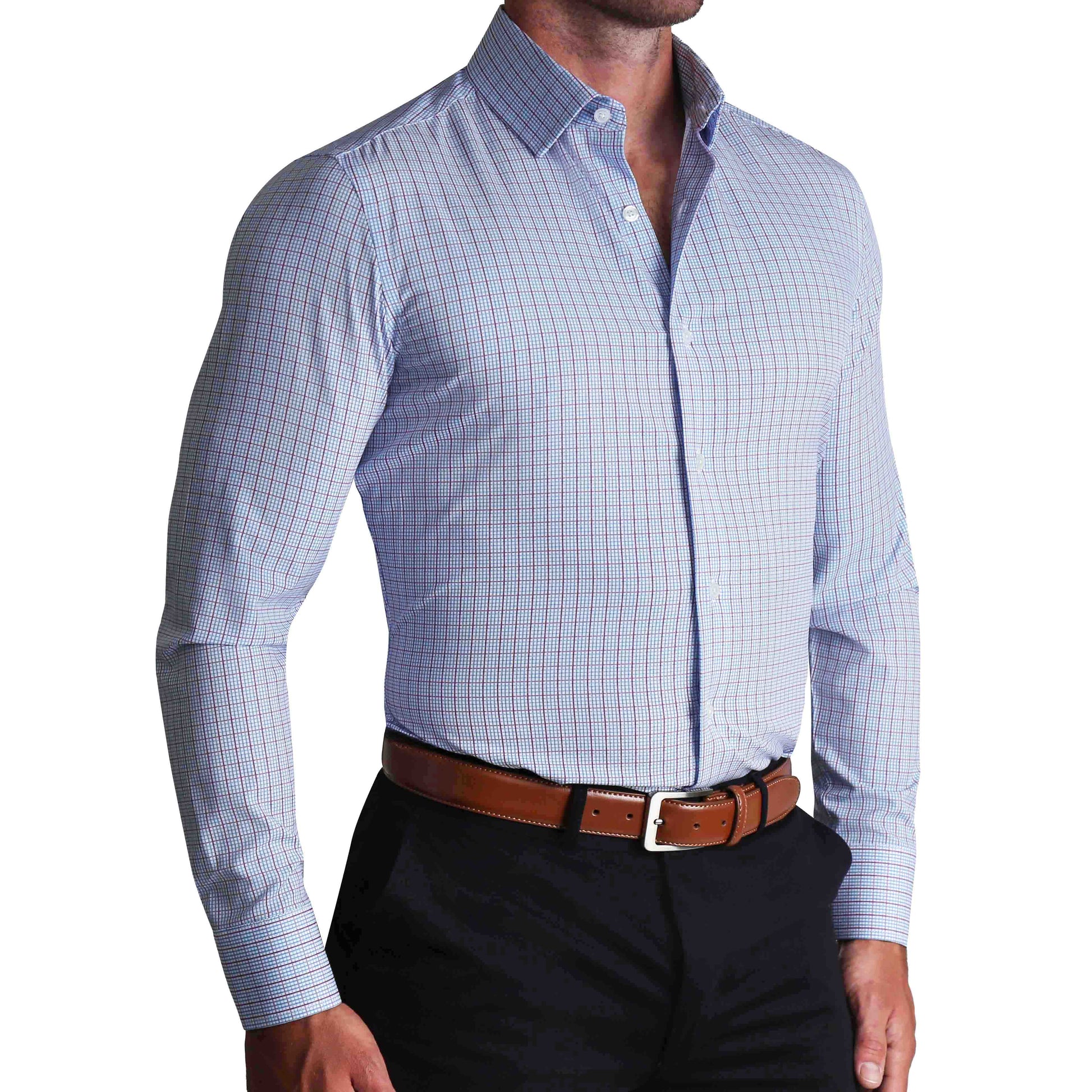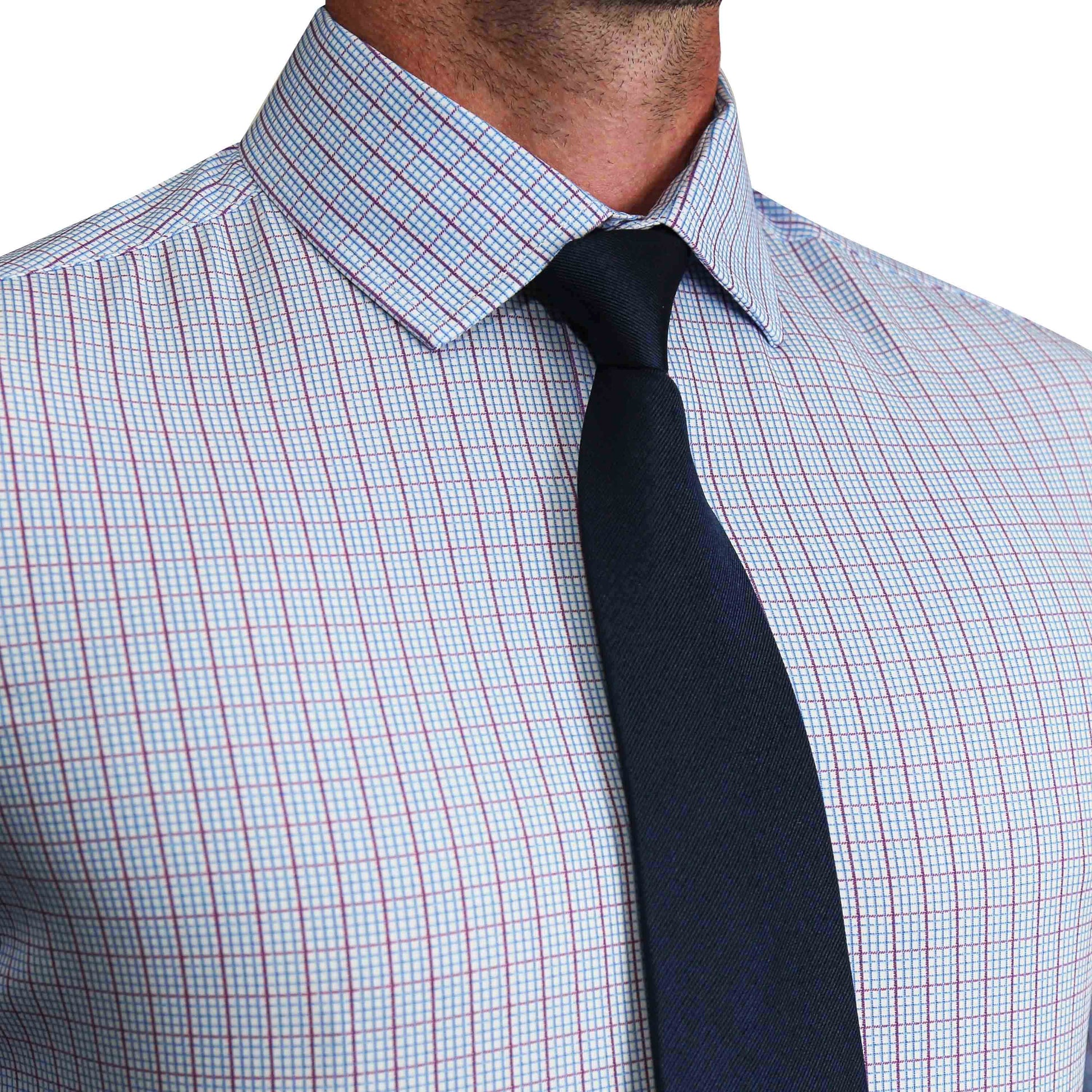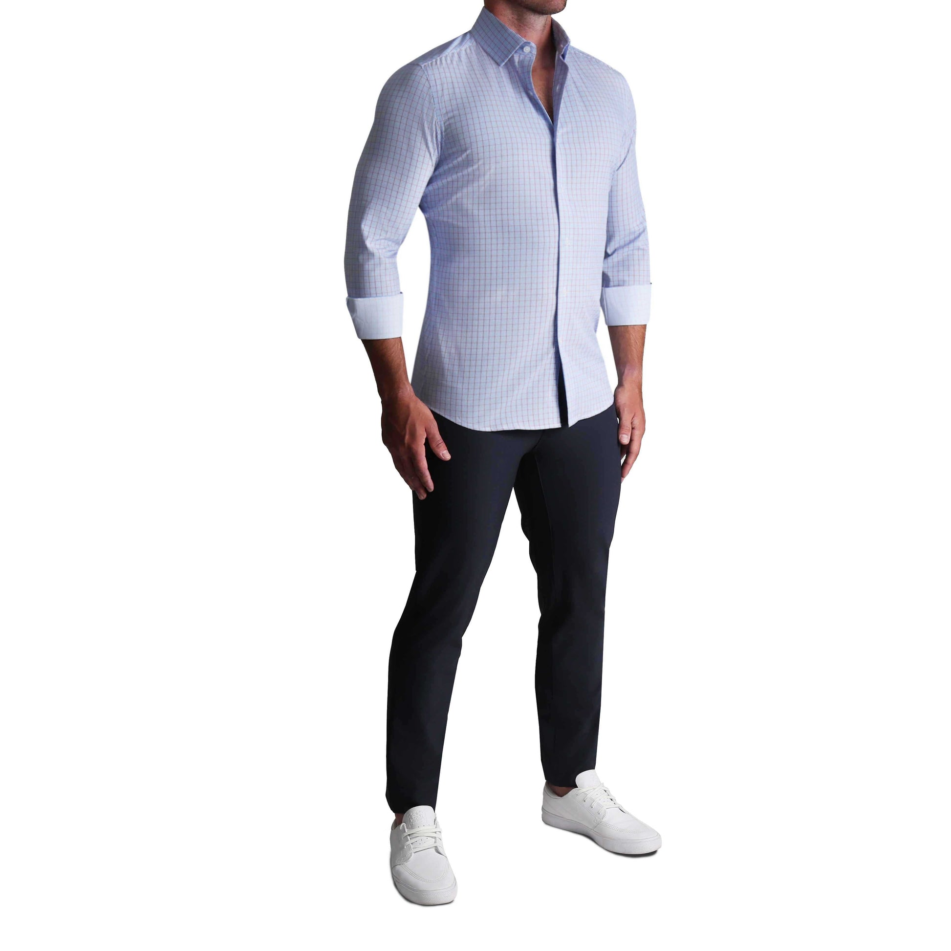 Our signature athletic fit dress shirt crafted from performance stretch fabrics. "The Ivaan" blue & purple double grid is an excellent business casual staple that makes a versatile addition to any dress shirt collection.