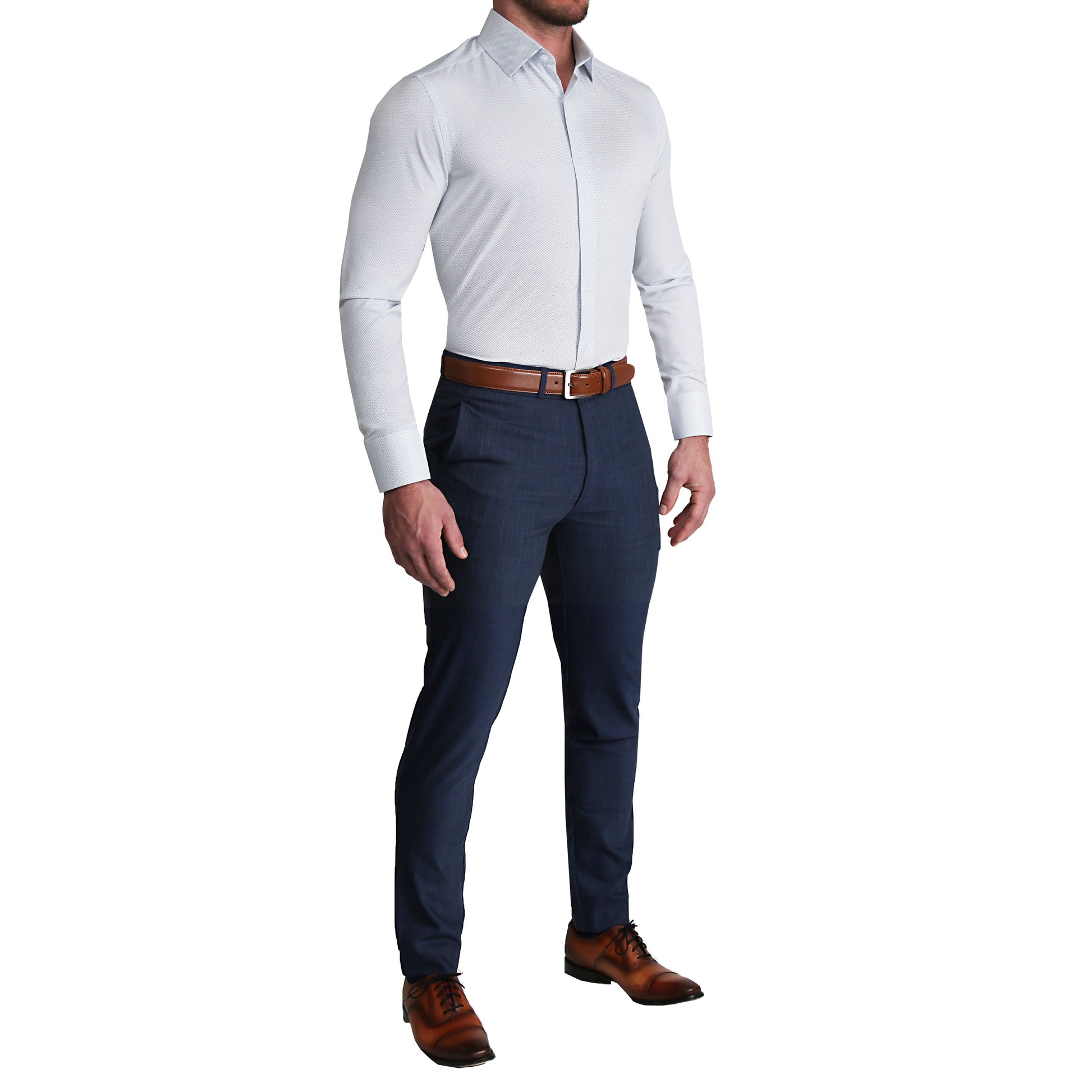 Our signature athletic fit dress shirt crafted from performance stretch fabrics. "The Jameson" mini navy dot print is an excellent business casual staple that makes a versatile addition to any dress shirt collection.
