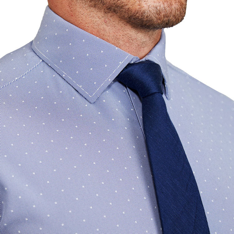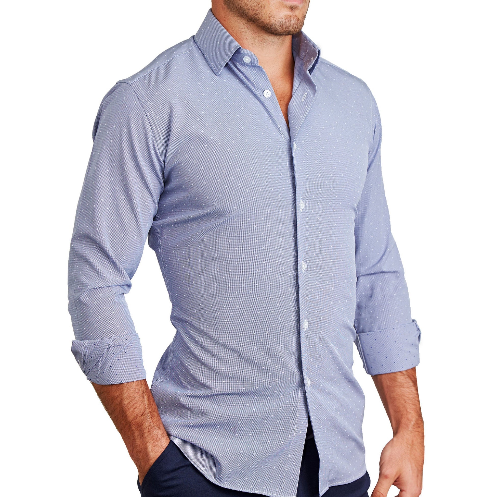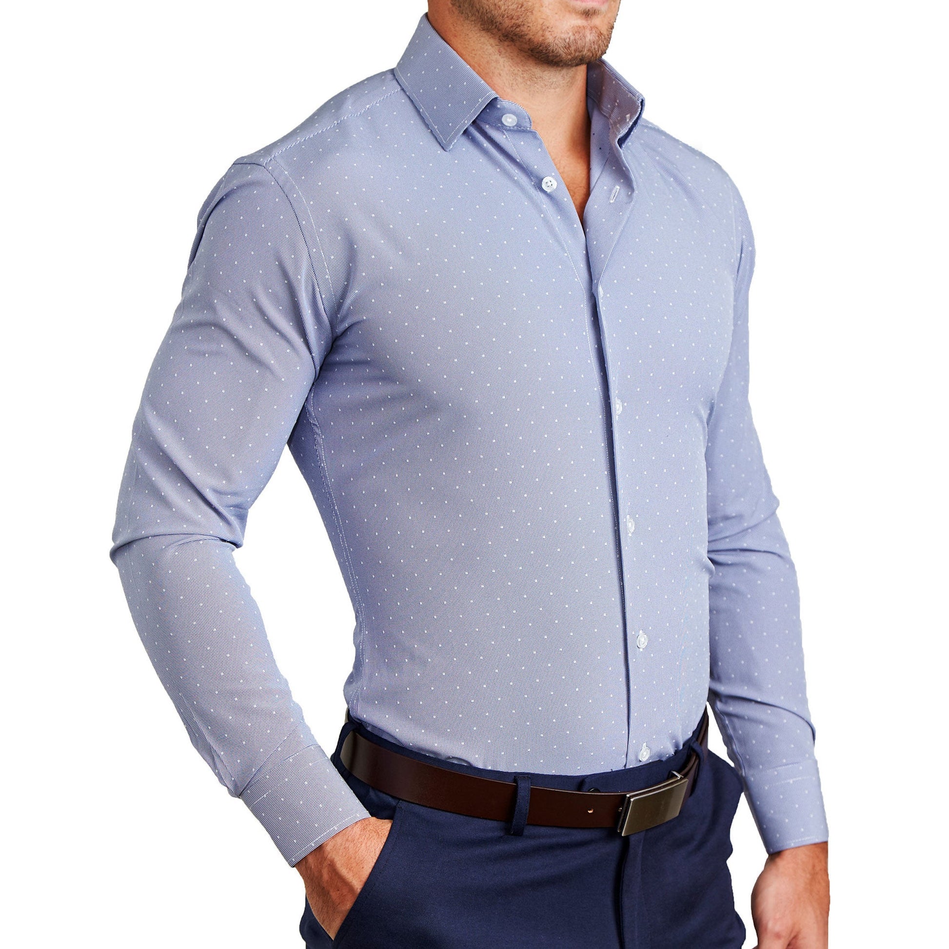 Our signature athletic fit dress shirt crafted from performance stretch fabrics. "The Lambert" Blue with White Dots is an excellent business casual staple that makes a versatile addition to any dress shirt collection.