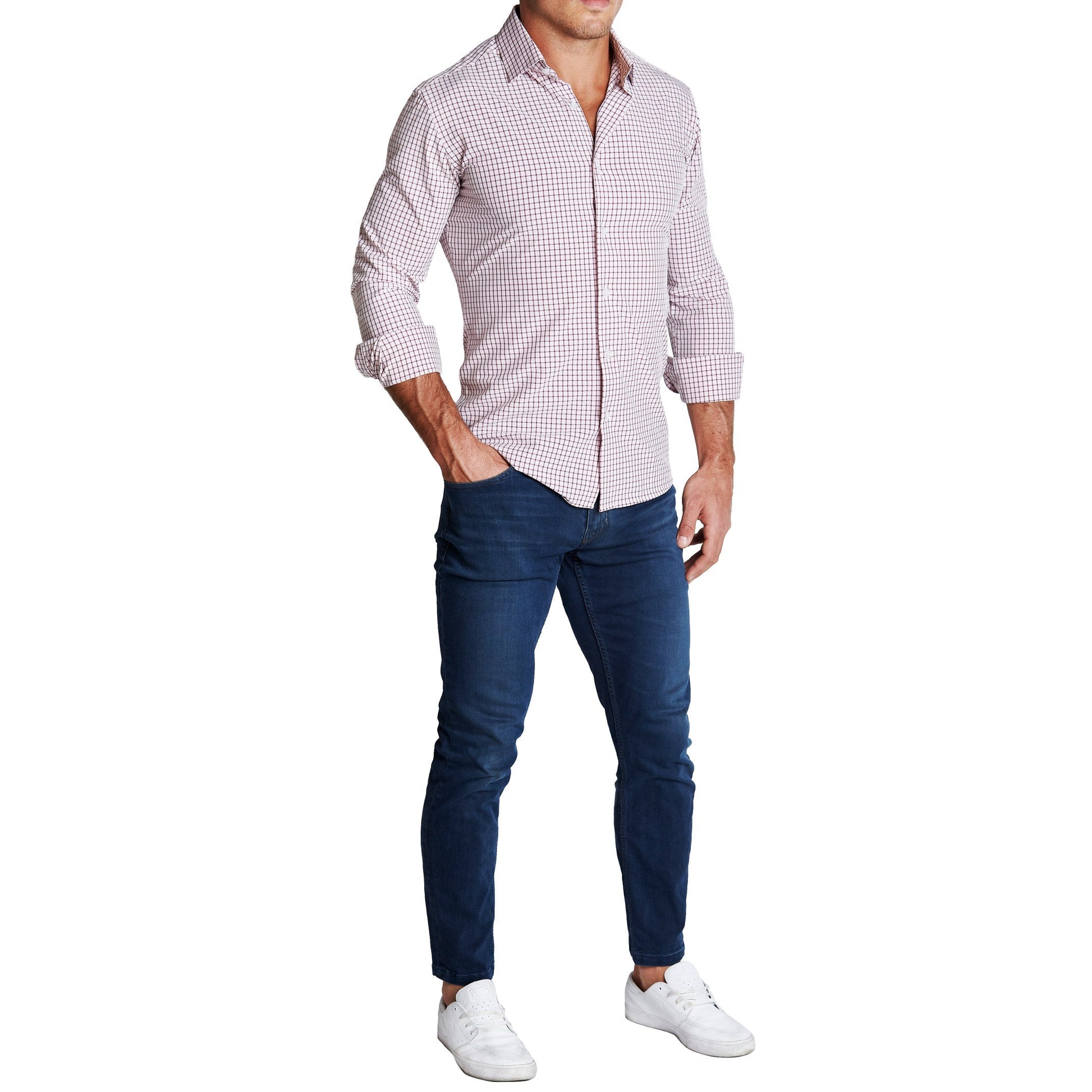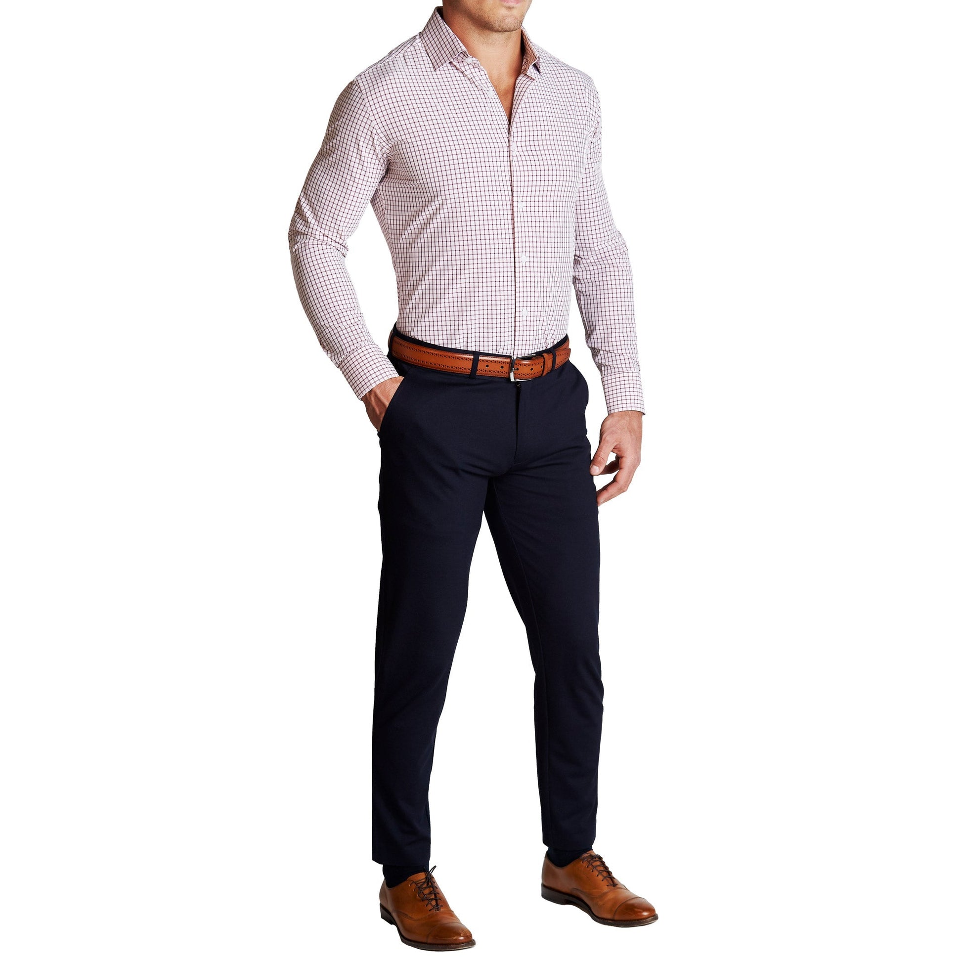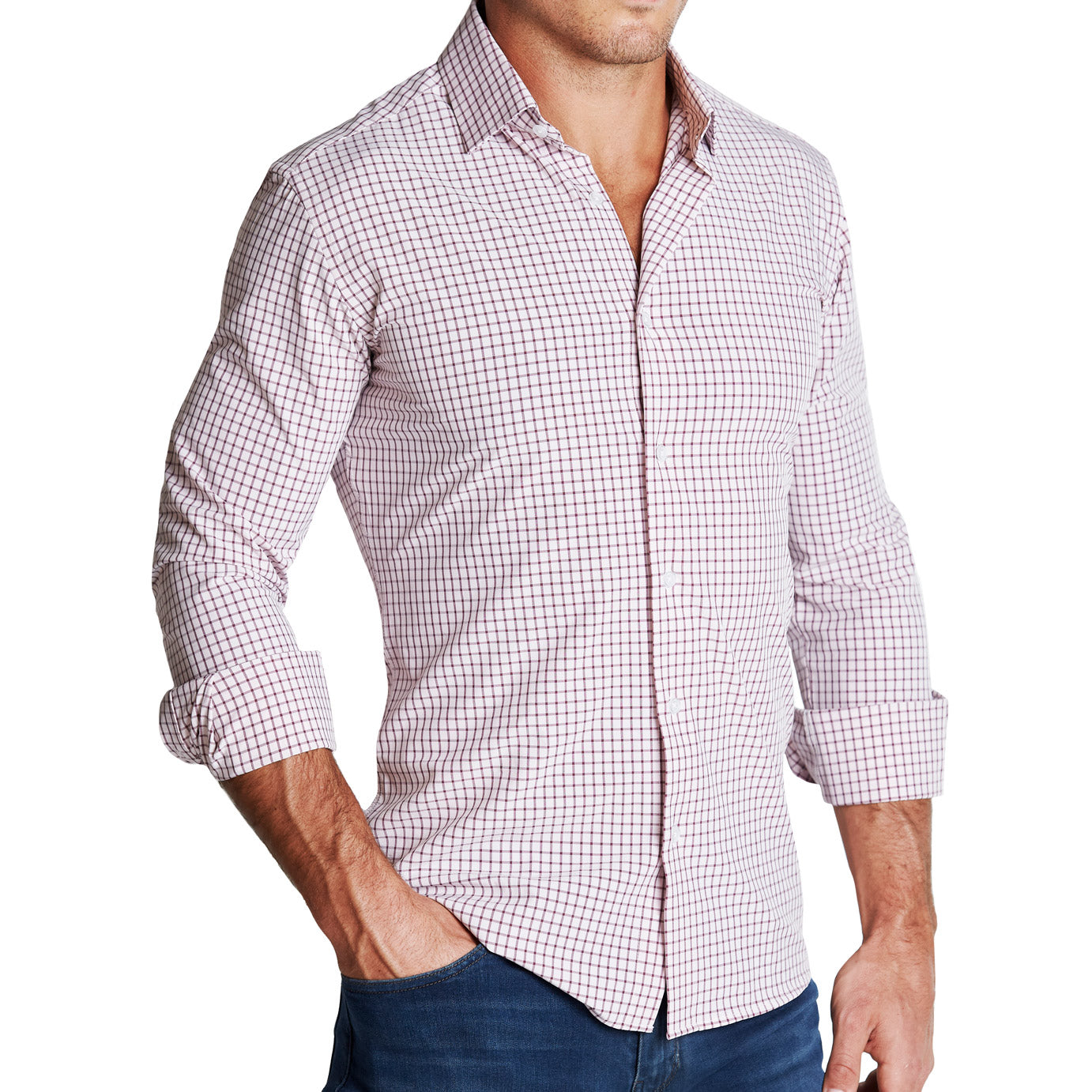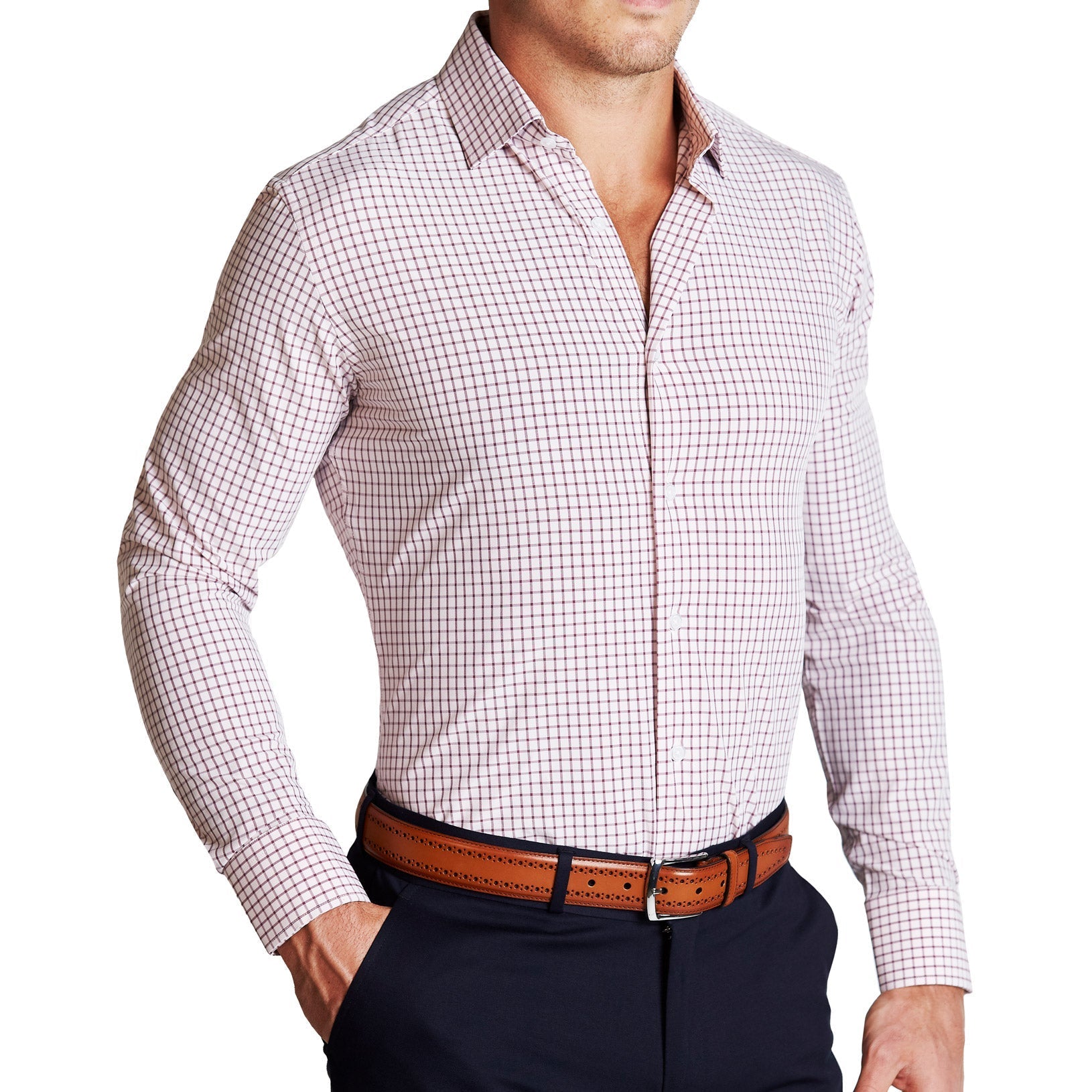 Our signature athletic fit dress shirt crafted from performance stretch fabrics. "The Maurice" Maroon Windowpane is an excellent business casual staple that makes a versatile addition to any dress shirt collection.