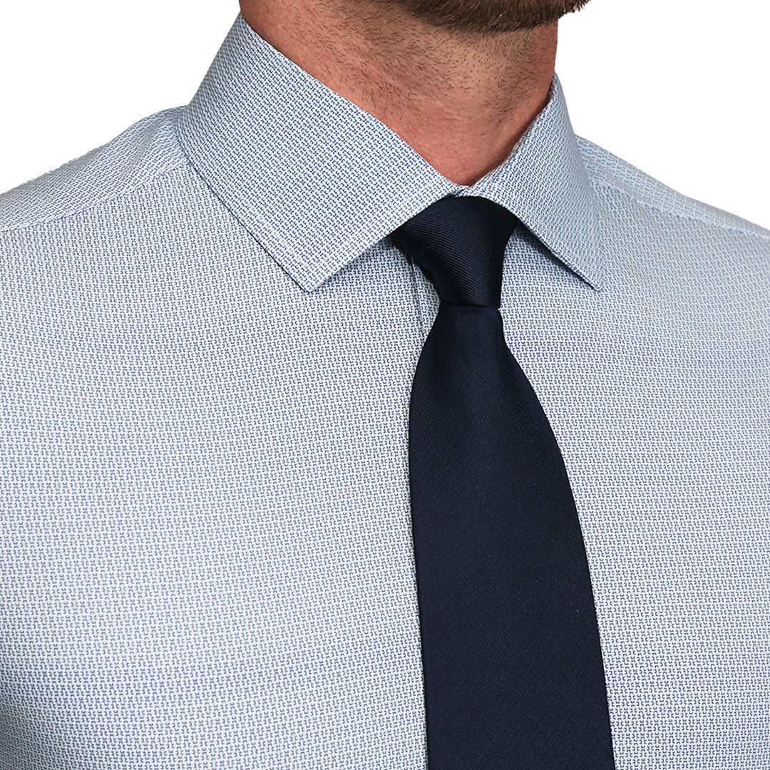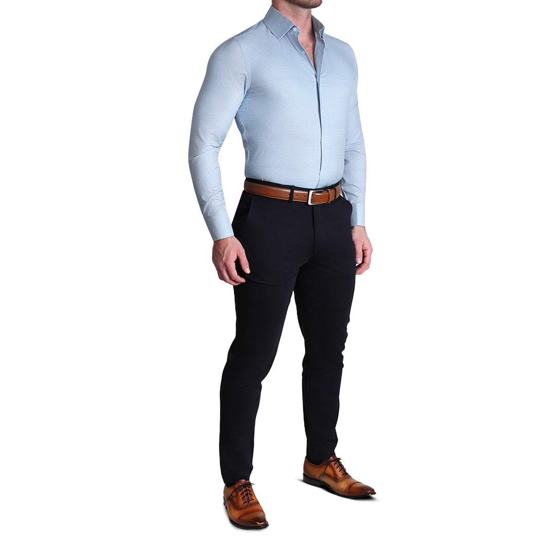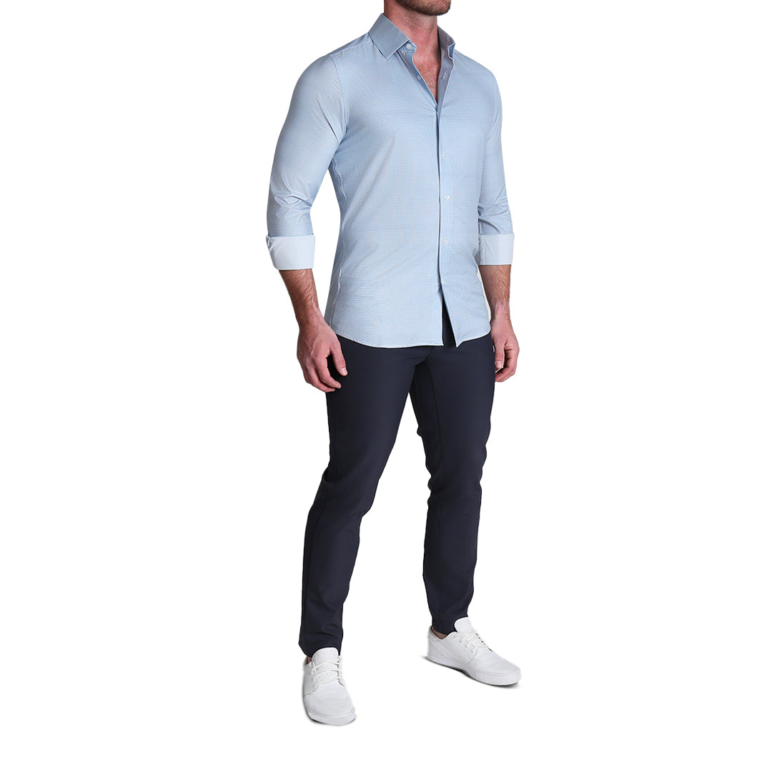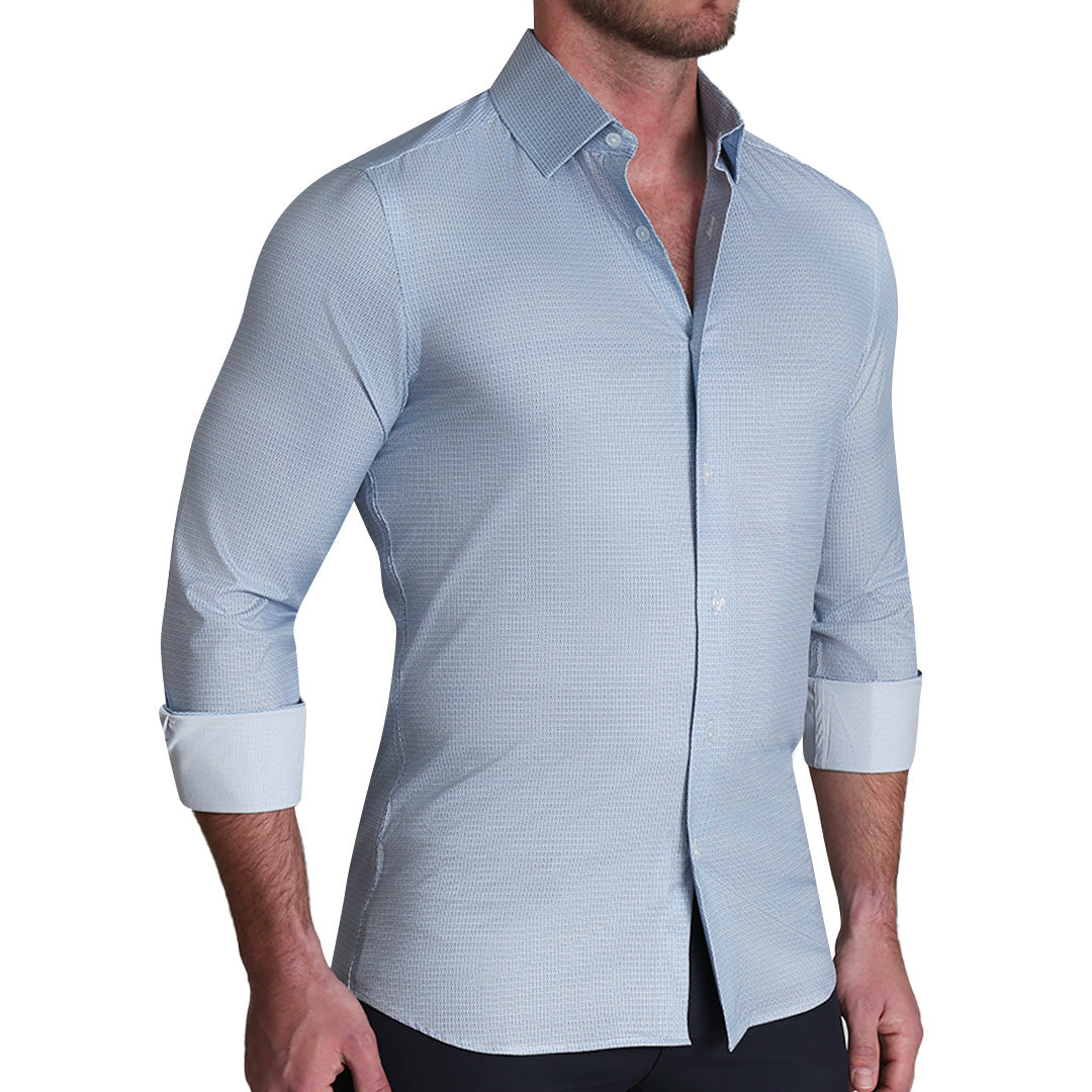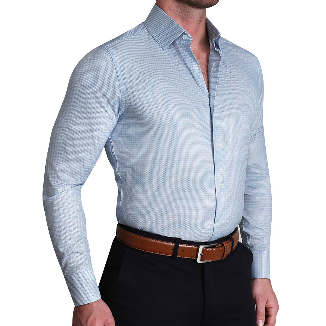 Our signature athletic fit dress shirt crafted from performance stretch fabrics. "The Niko" blue mini lock is an excellent business casual staple that makes a versatile addition to any dress shirt collection.