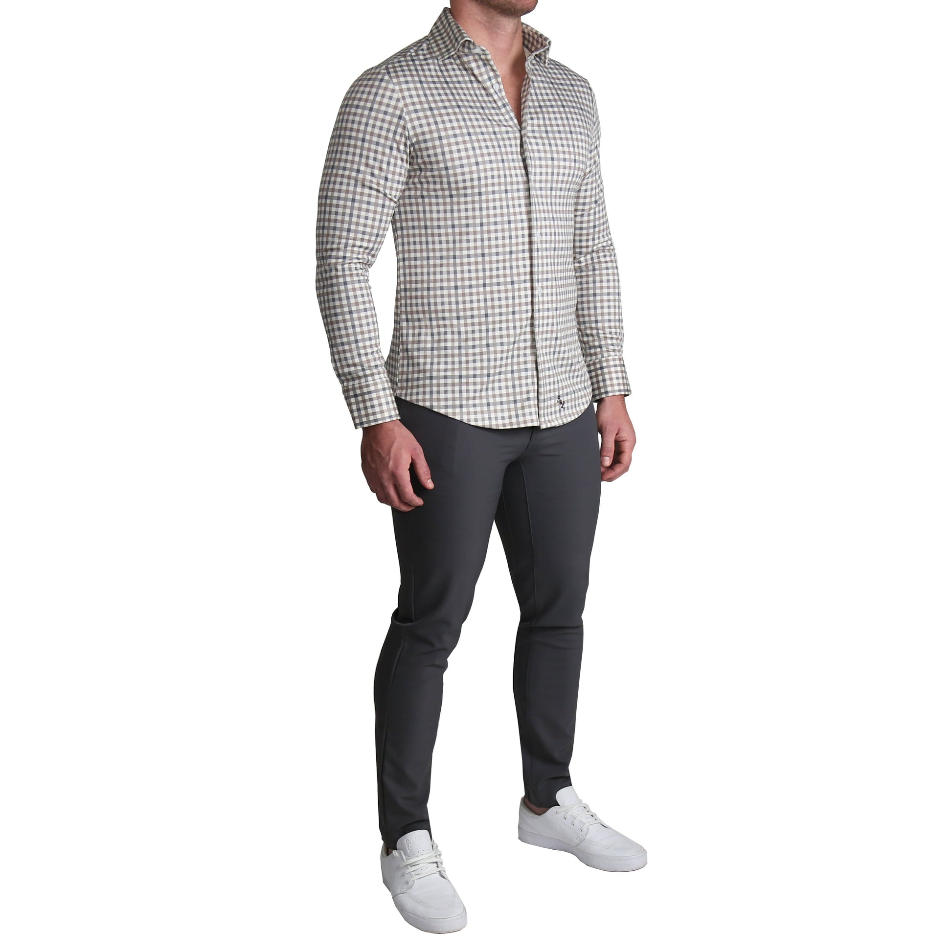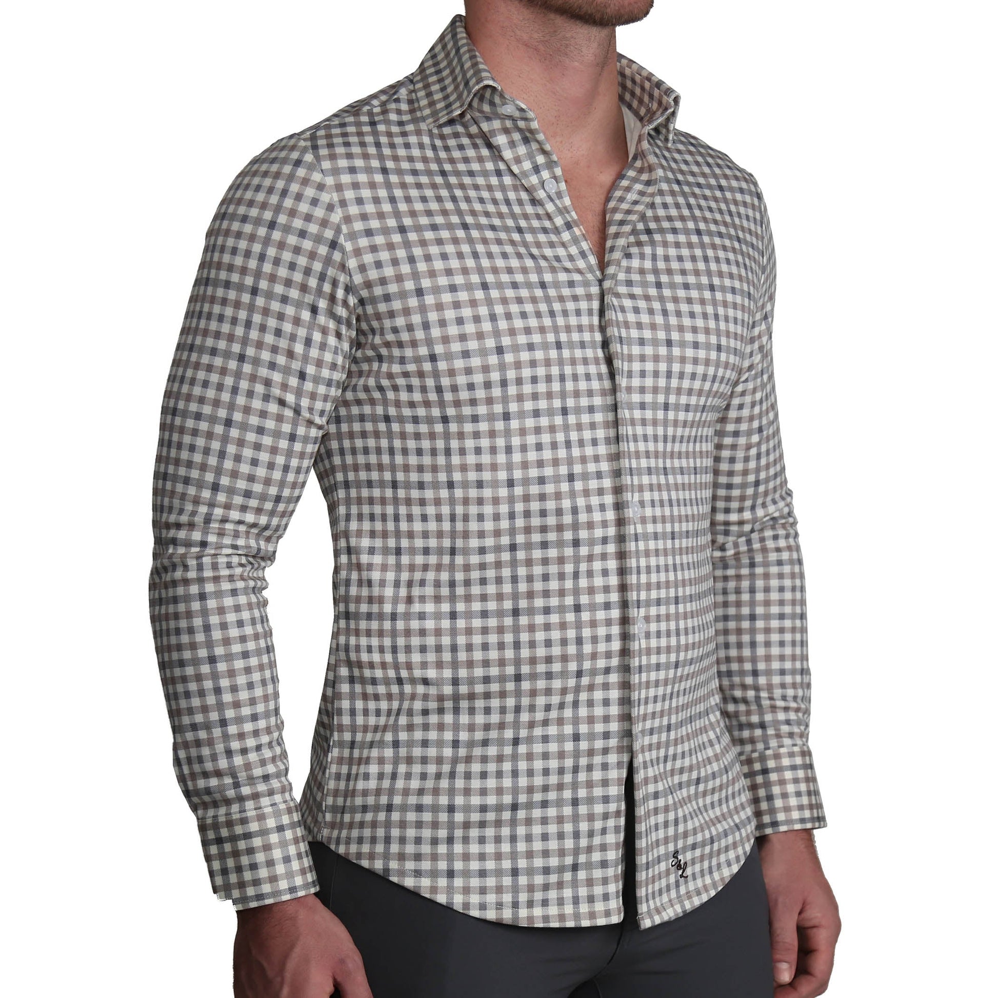 A true athletic fit casual button down crafted from a soft-brushed polyester-spandex blend, this Brown, Grey, and White Gingham button down is as stretchy and comfortable as it gets. Featuring shortened length and a curved hemline, this shirt is guaranteed to have you comfortable and sharp for both casual wear and a great night out.