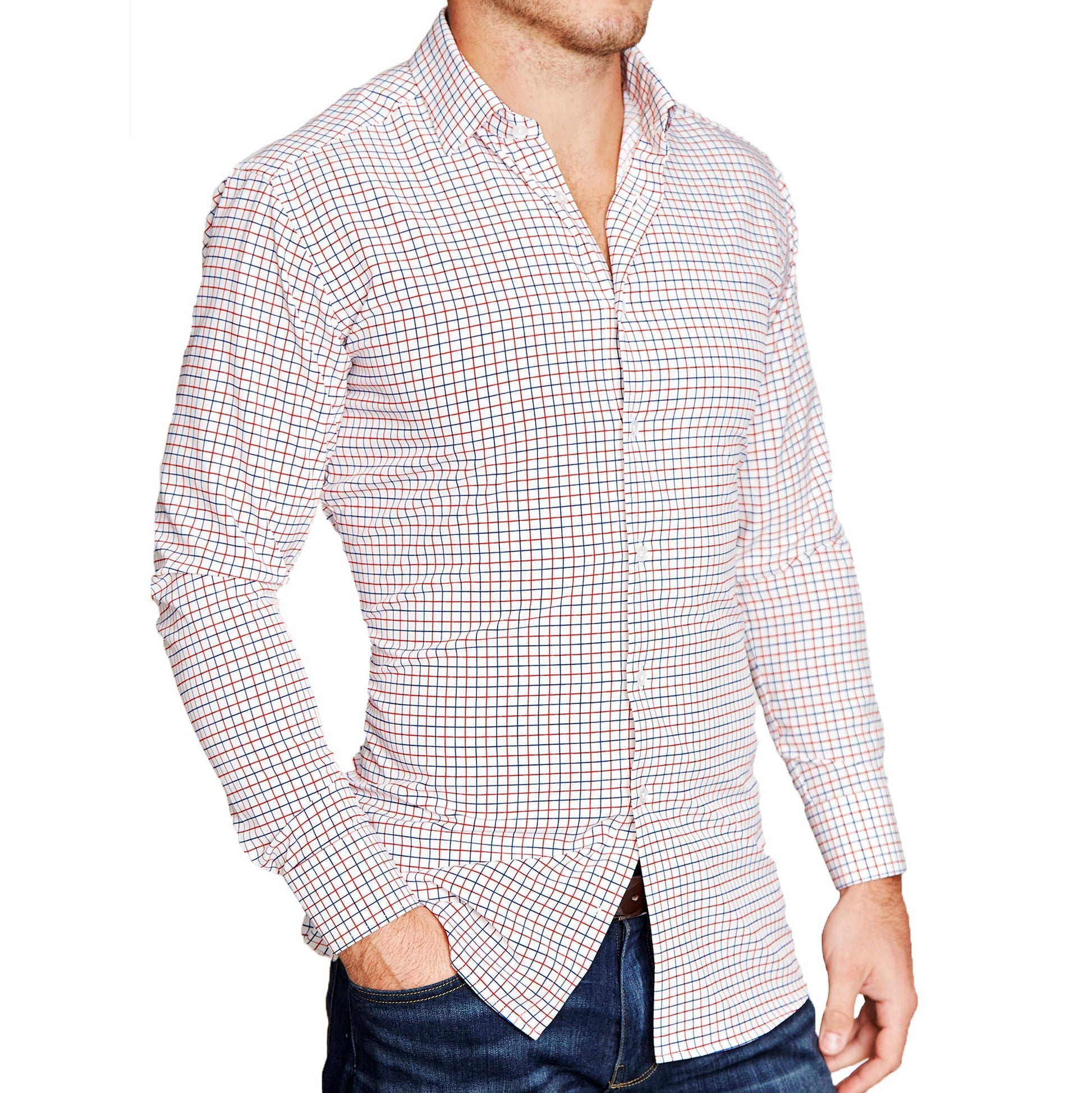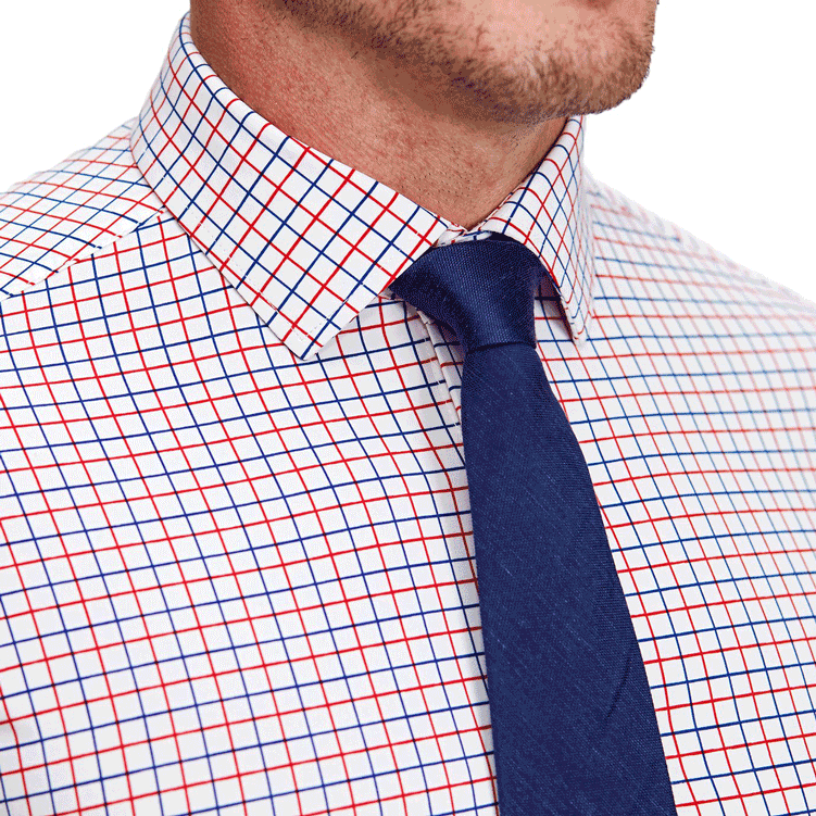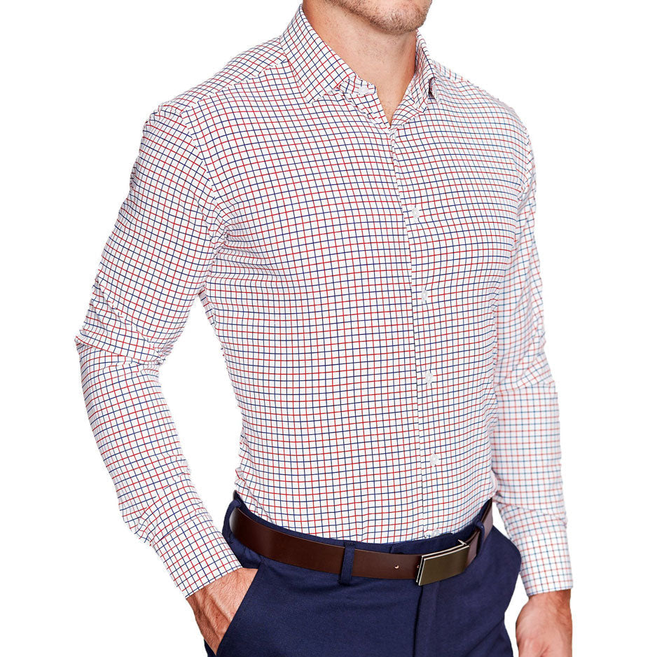 Our signature athletic fit dress shirt crafted from performance stretch fabrics. "The Potomac" Red and Blue Cross Stitch is an excellent business casual staple that makes a versatile addition to any dress shirt collection.