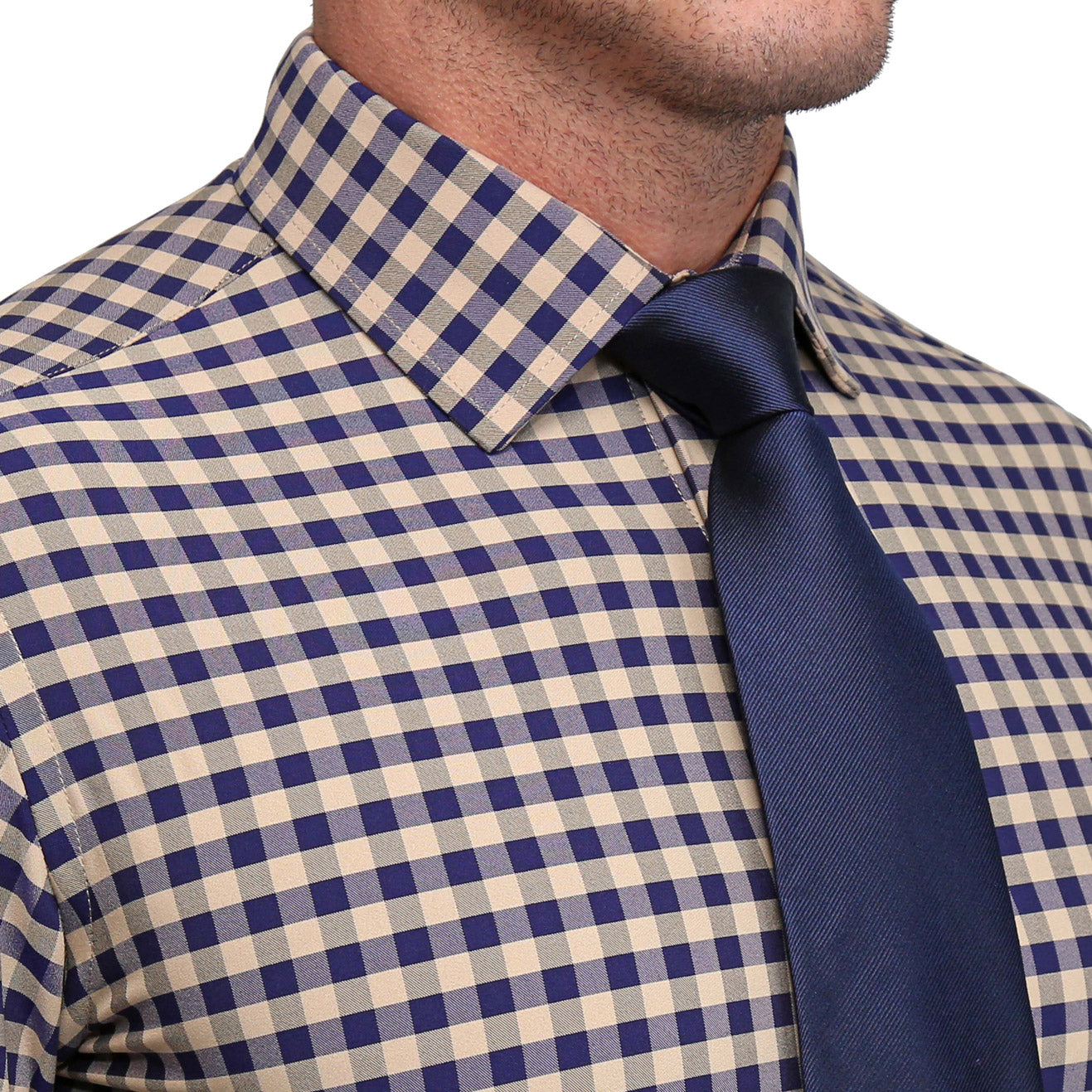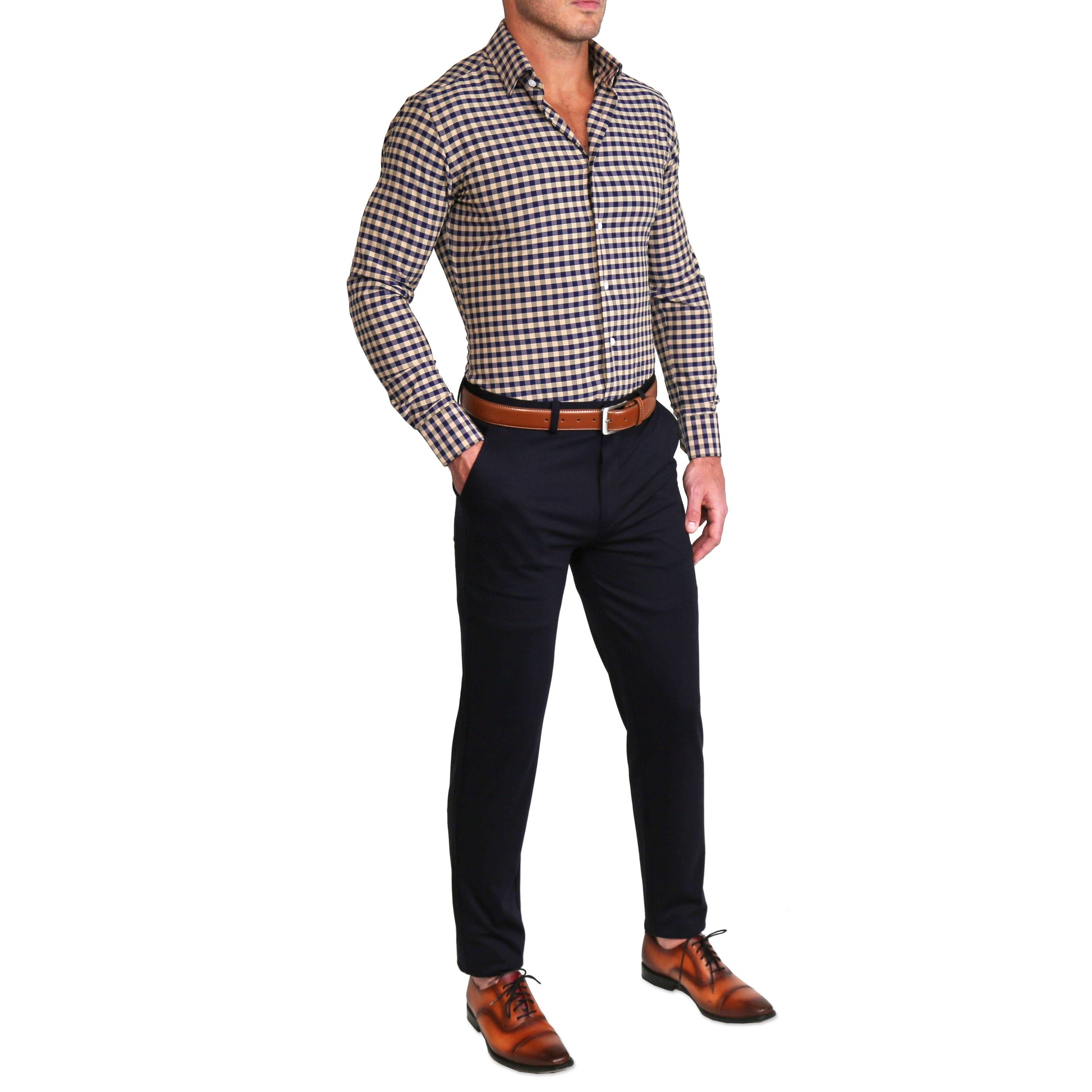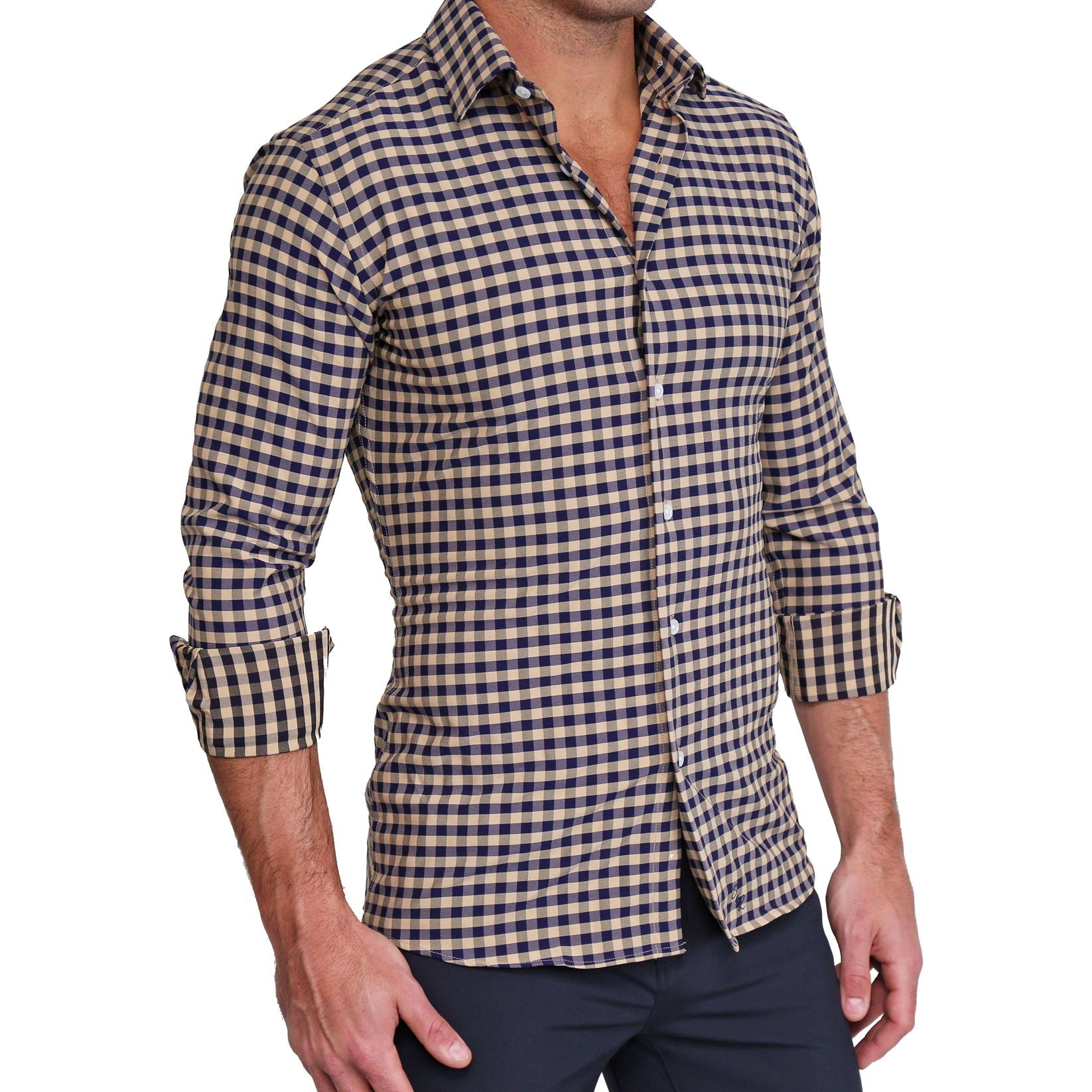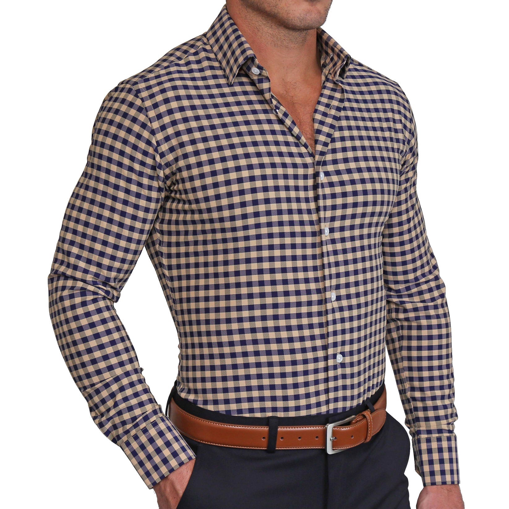Our signature athletic fit dress shirt crafted from performance stretch fabrics. "The Riggins" Brown, Navy and Grey Triple Check is an excellent business casual staple that makes a versatile addition to any dress shirt collection.
