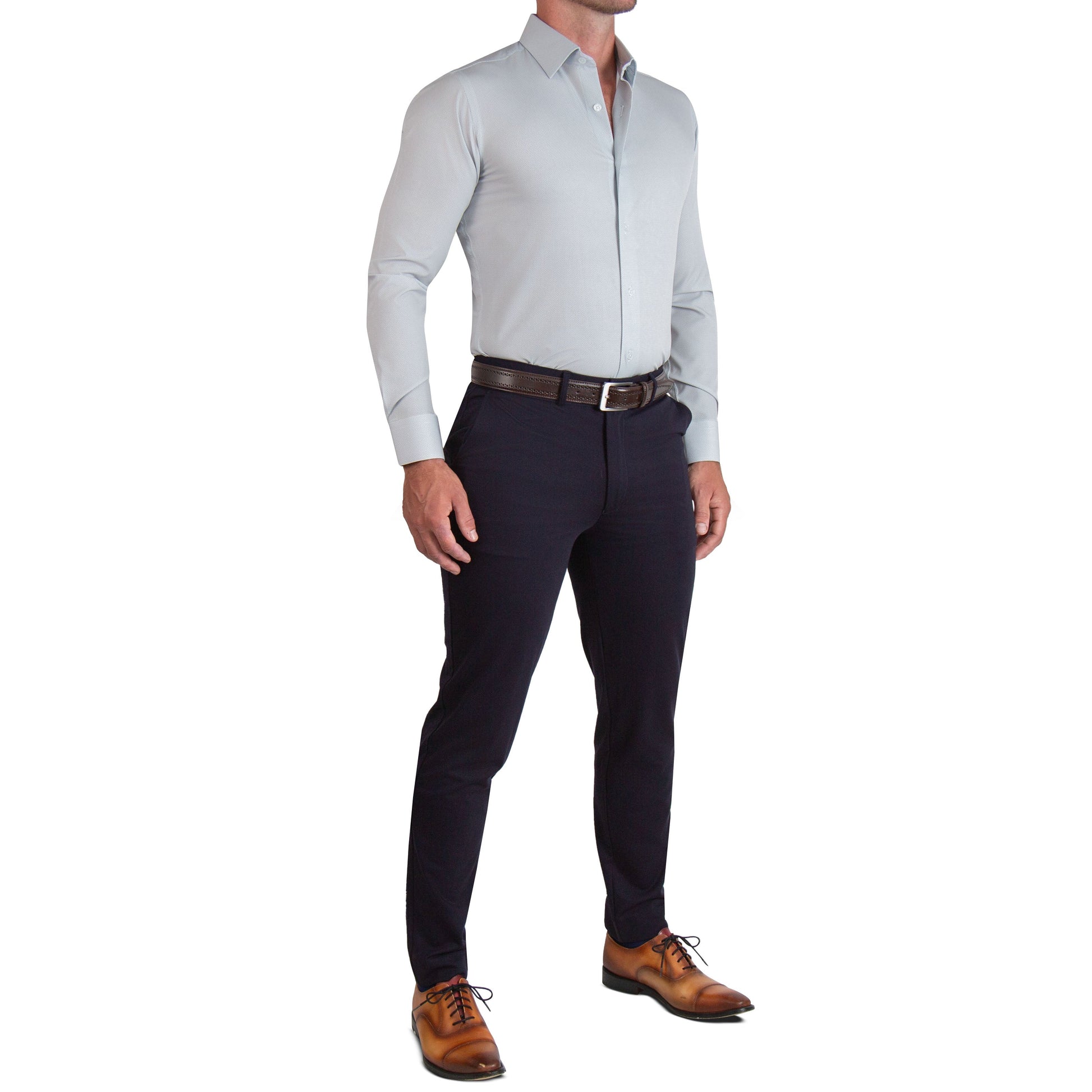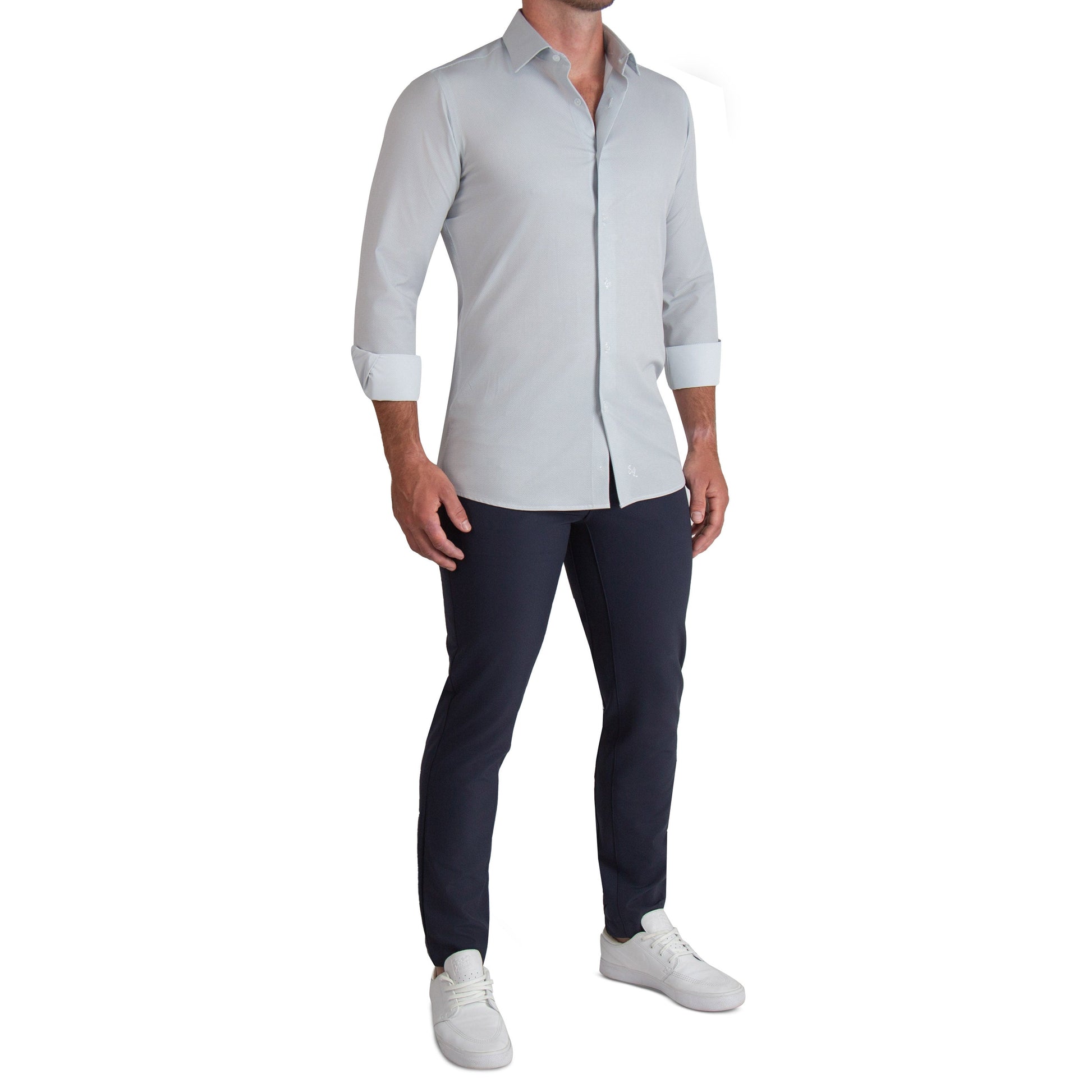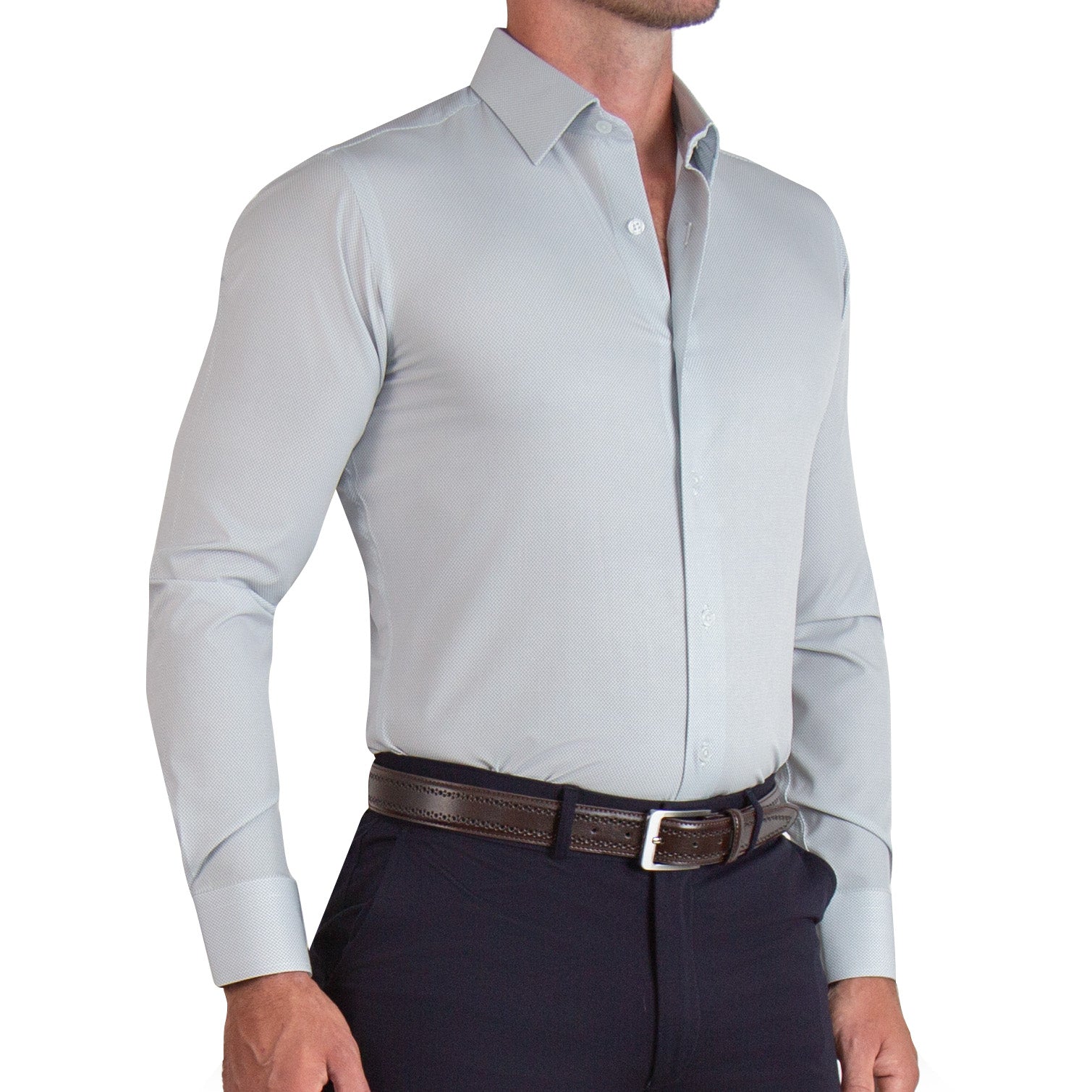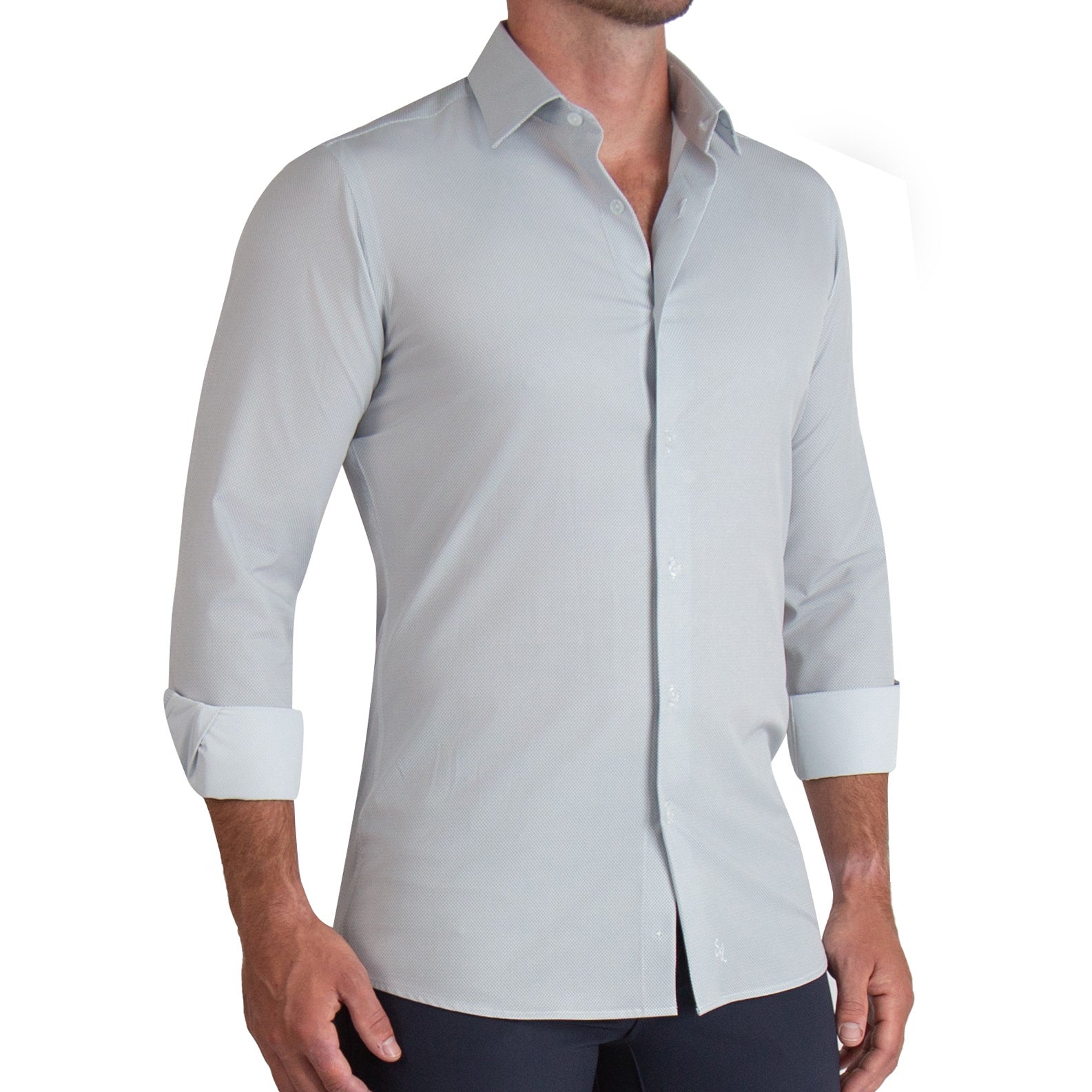 Our signature athletic fit dress shirt crafted from performance stretch fabrics. "The Robby" grey and white herringbone is an excellent business casual staple that makes a versatile addition to any dress shirt collection.