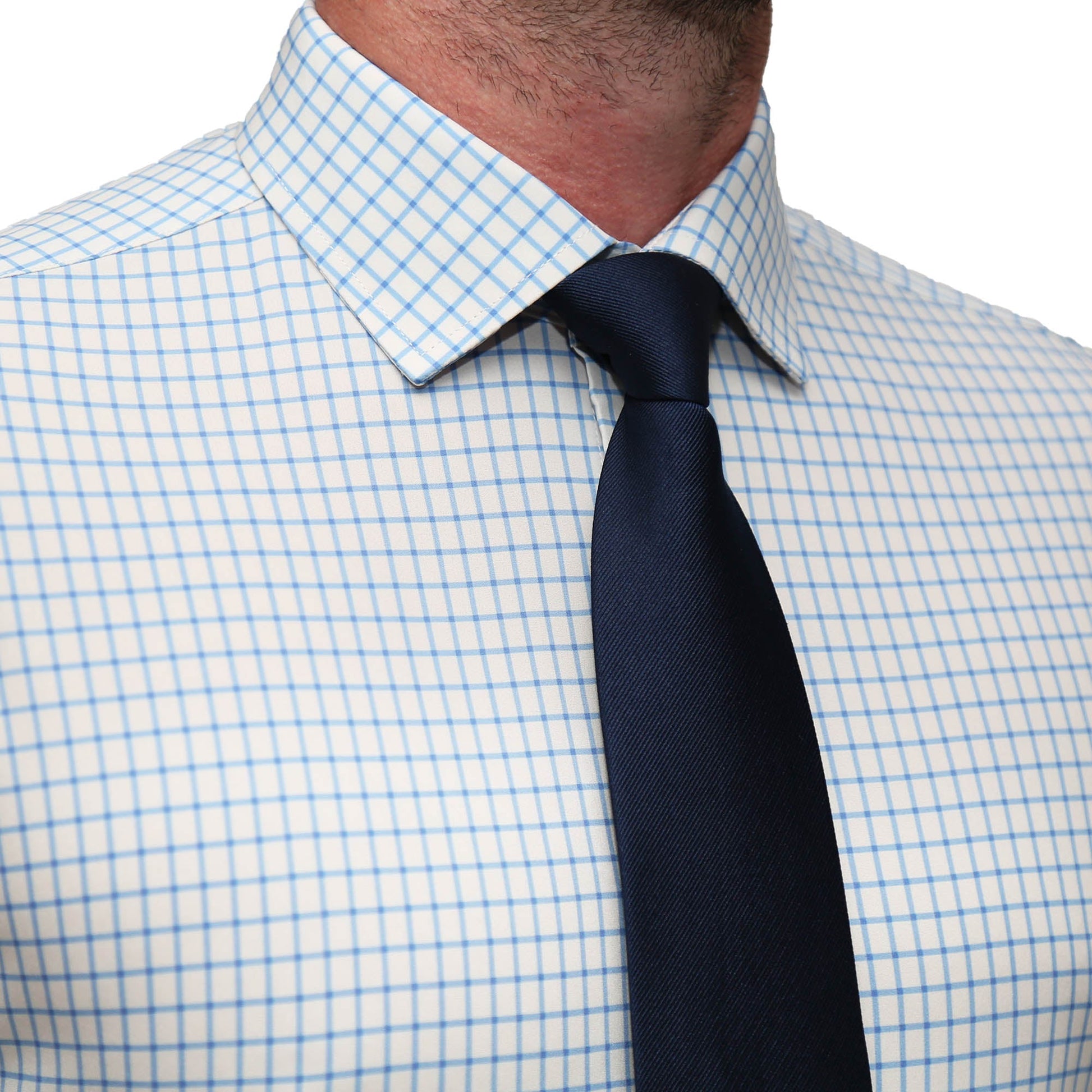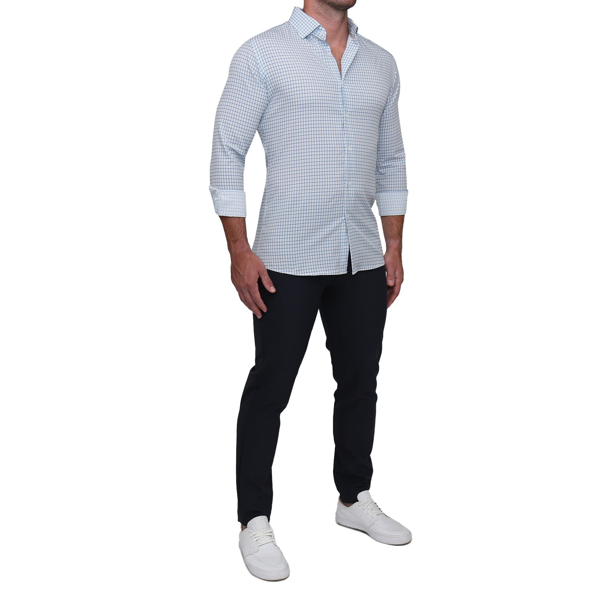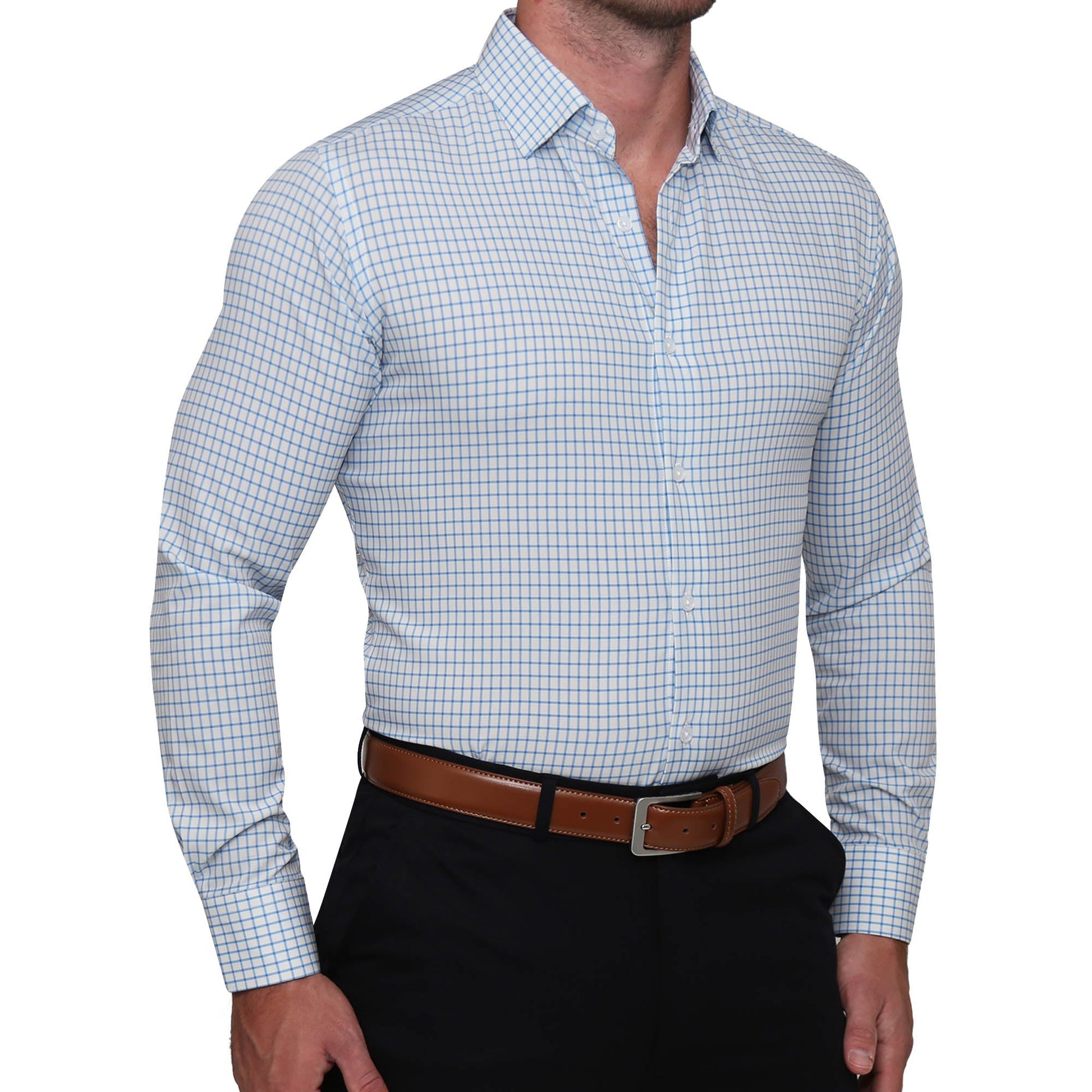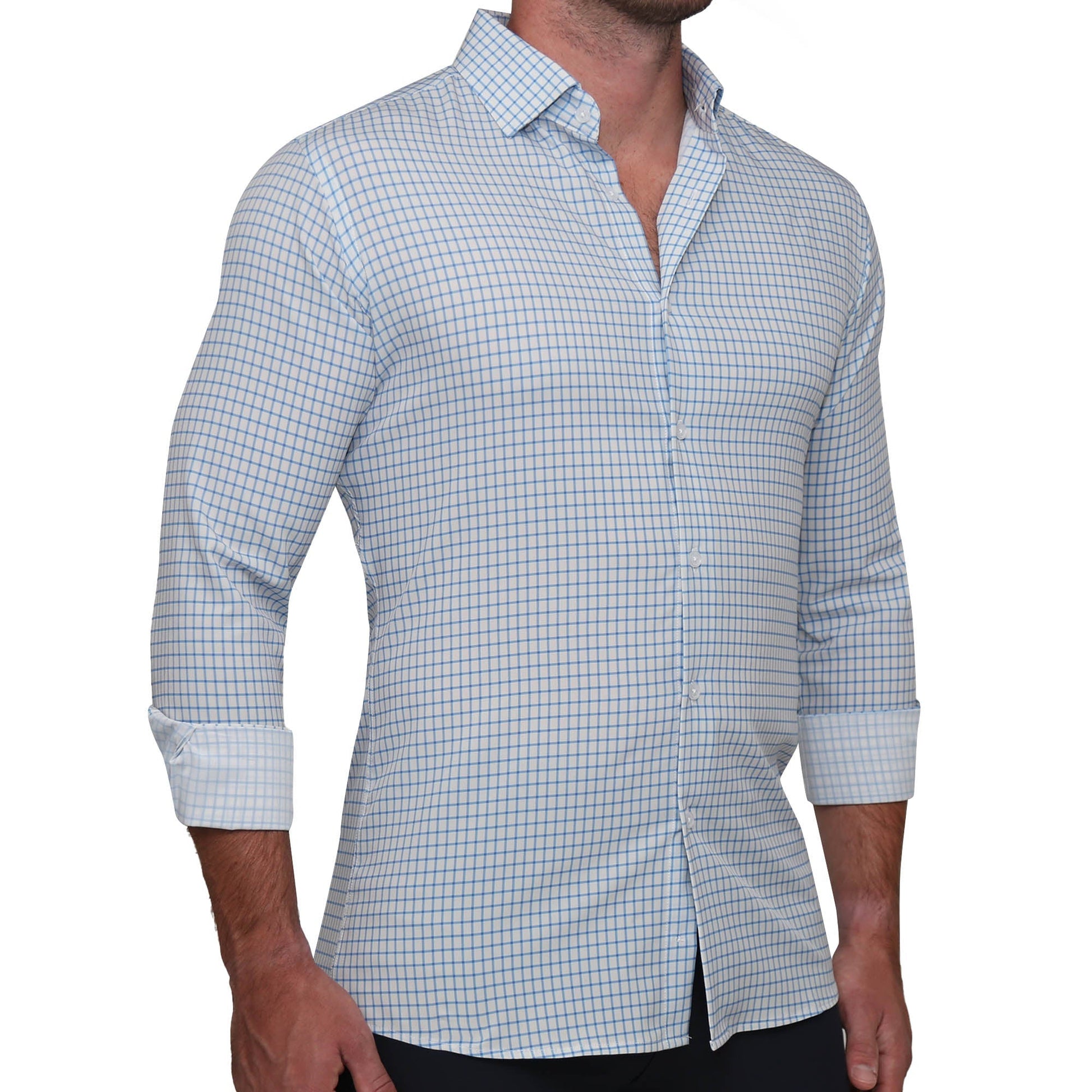 Our signature athletic fit dress shirt crafted from performance stretch fabrics. "The Soho" Light Blue Windowpane is an excellent business casual staple that makes a versatile addition to any dress shirt collection.
