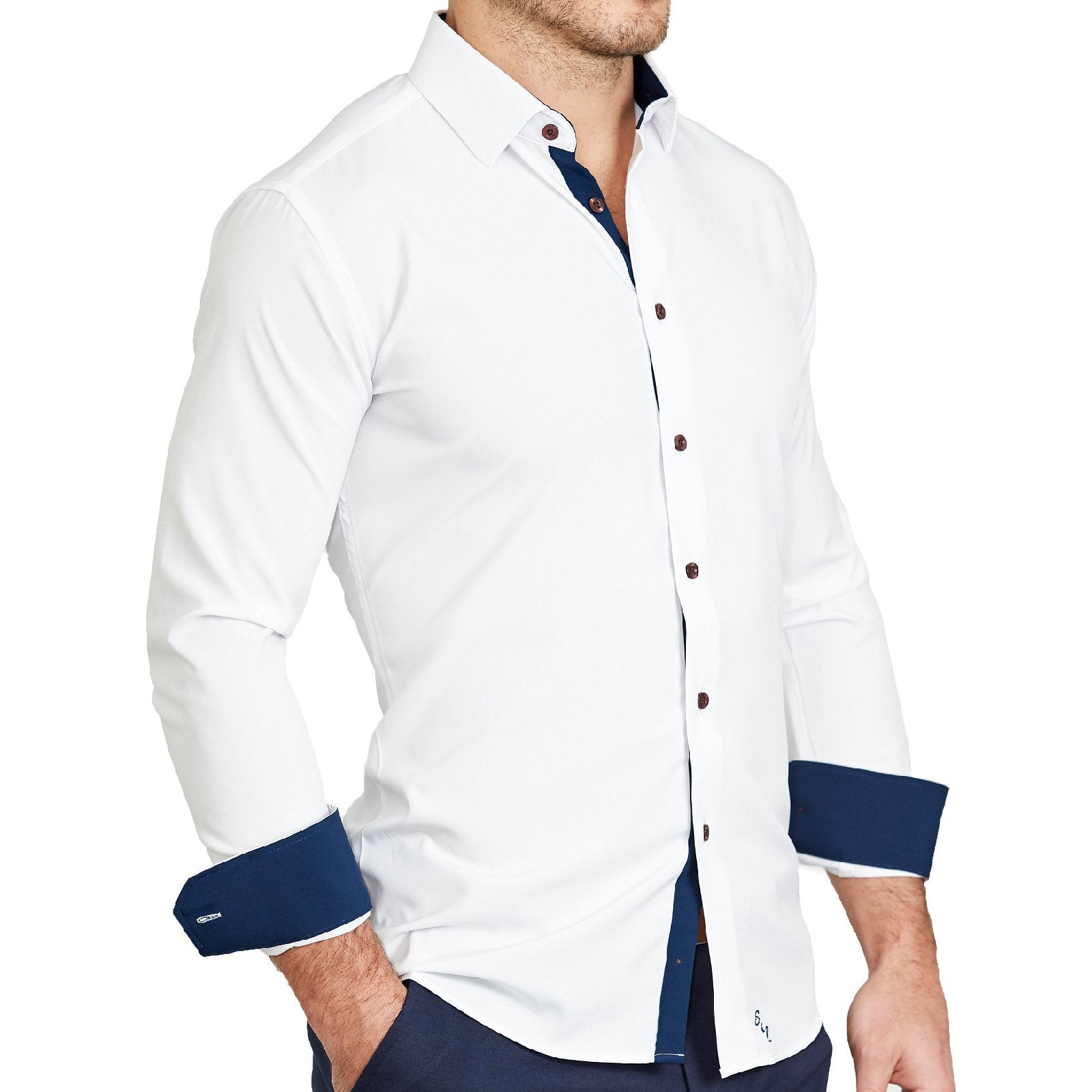 Additional Styling: Hidden under-the-collar button equipped with stainless steel collar stays