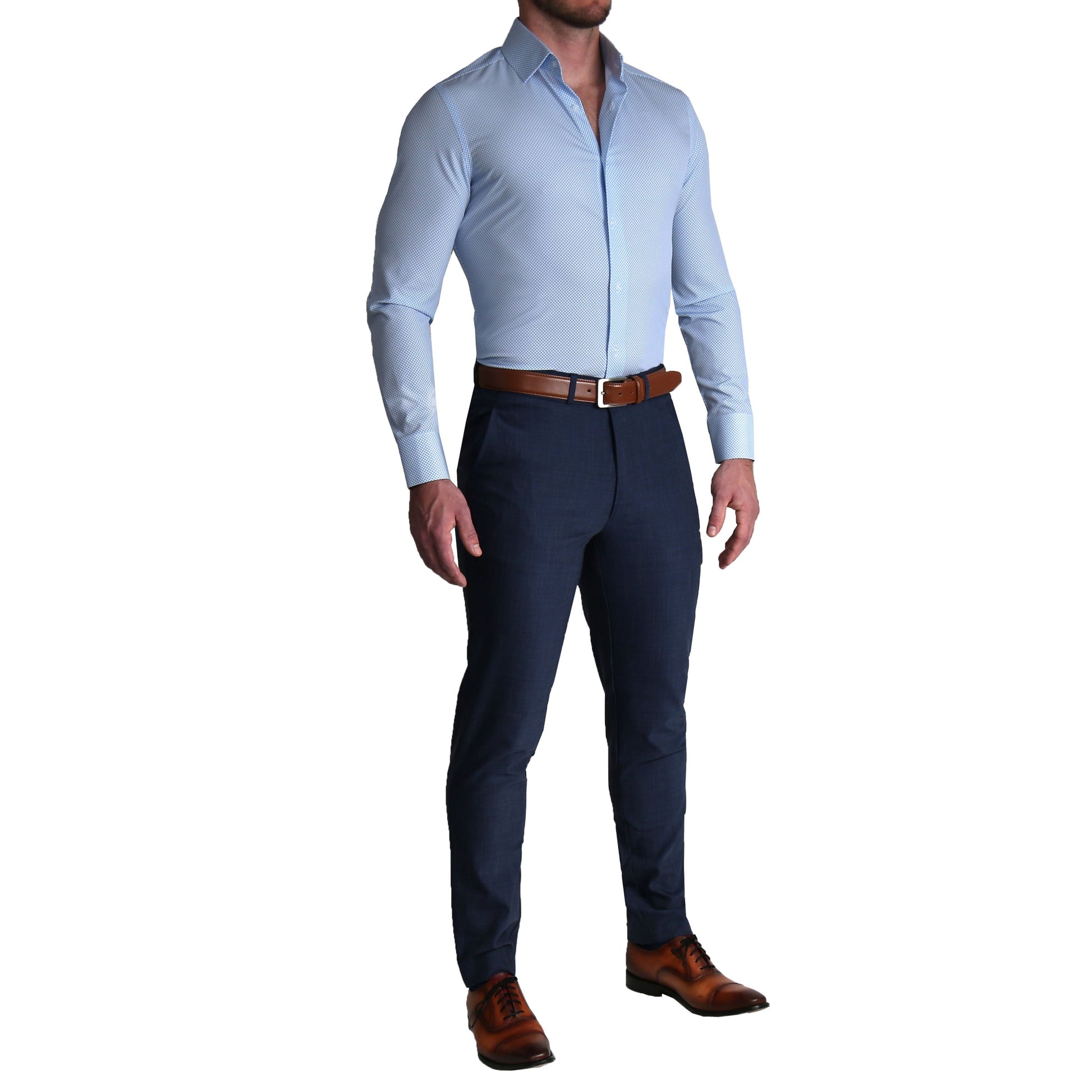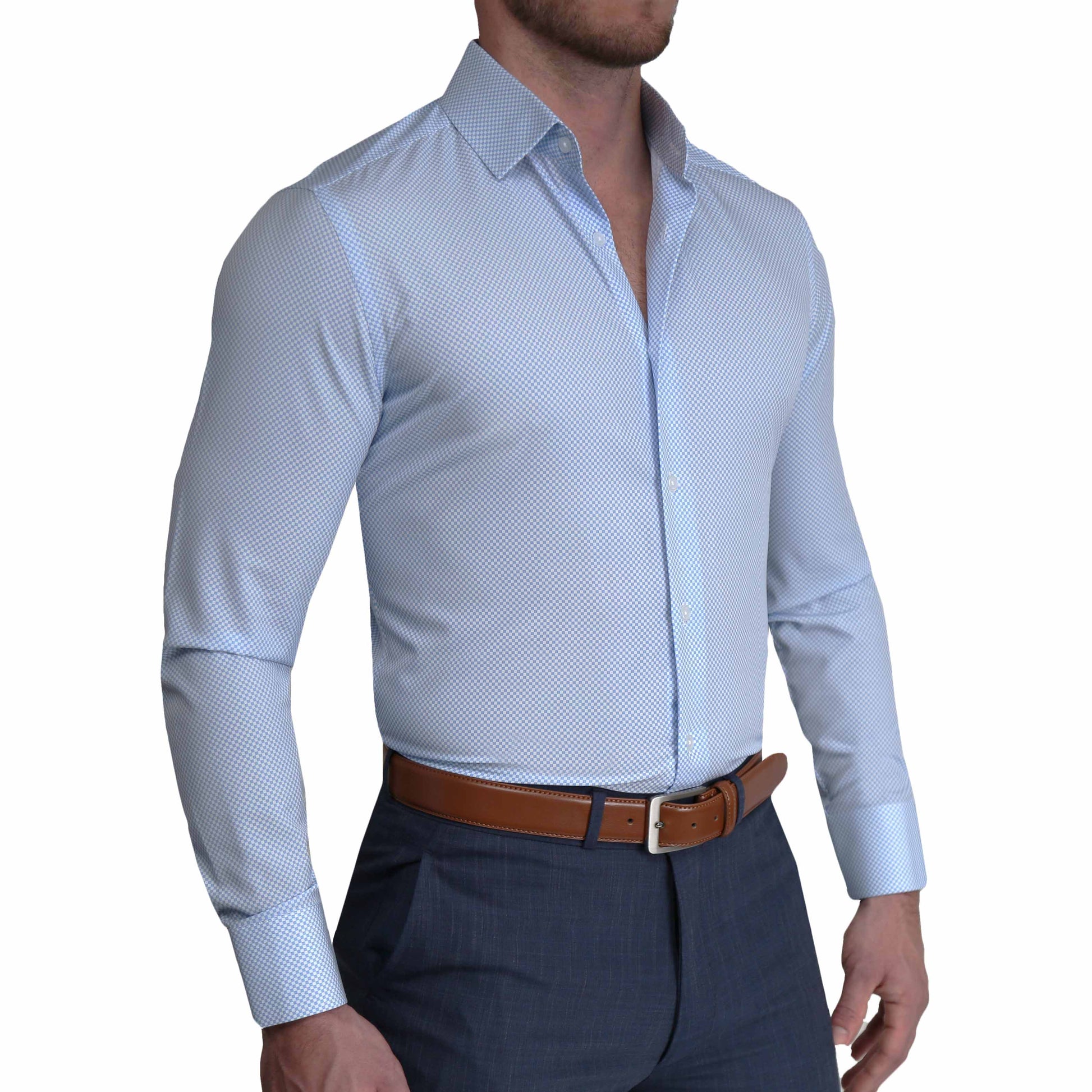 Our signature athletic fit dress shirt crafted from performance stretch fabrics. "The Vernor" light blue square check print is an excellent business casual staple that makes a versatile addition to any dress shirt collection.