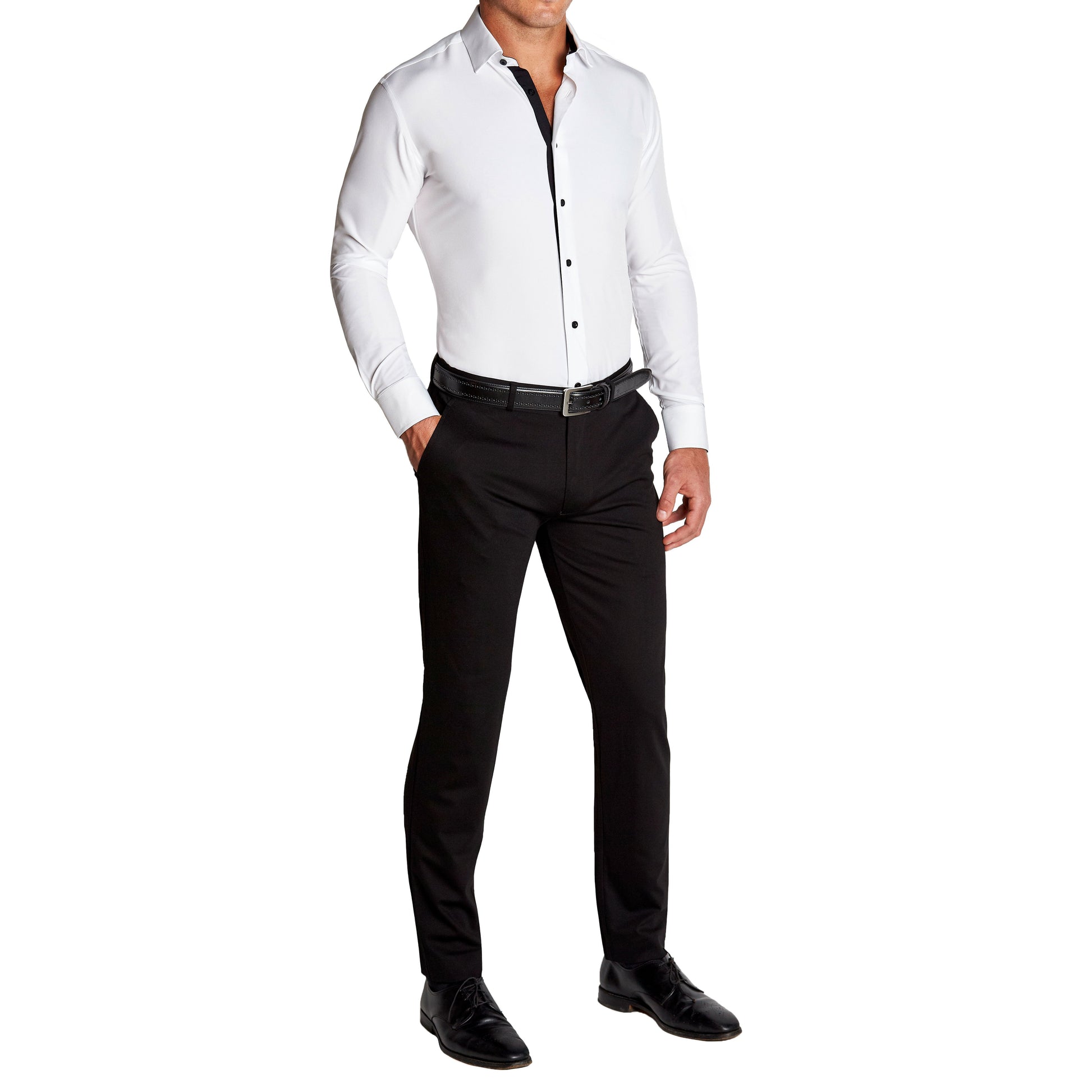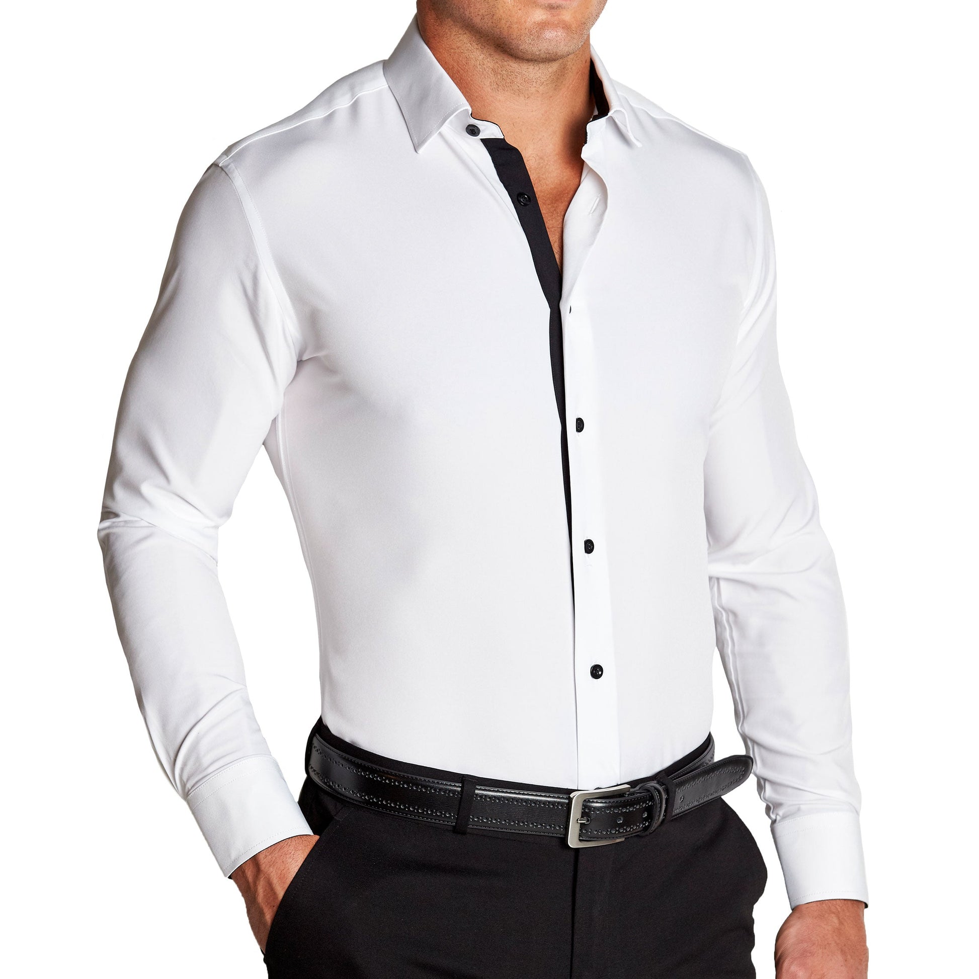 Our signature athletic fit dress shirt crafted from performance stretch fabrics. "The Vincent" Solid White with Black Accents is an excellent business casual staple that makes a versatile addition to any dress shirt collection.